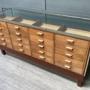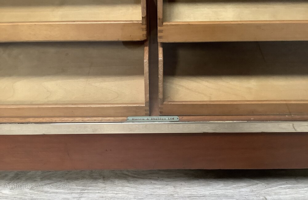 This exceptional Harris & Sheldon Ltd haberdashery counter is a striking example of vintage craftsmanship. The counter features a mahogany base and legs, complemented by a brass frame which elegantly surrounds the glazed display area. Its structure comprises 20 graduating drawers, each fitted with beech fronts, wooden handles, and label inserts for easy organisation.