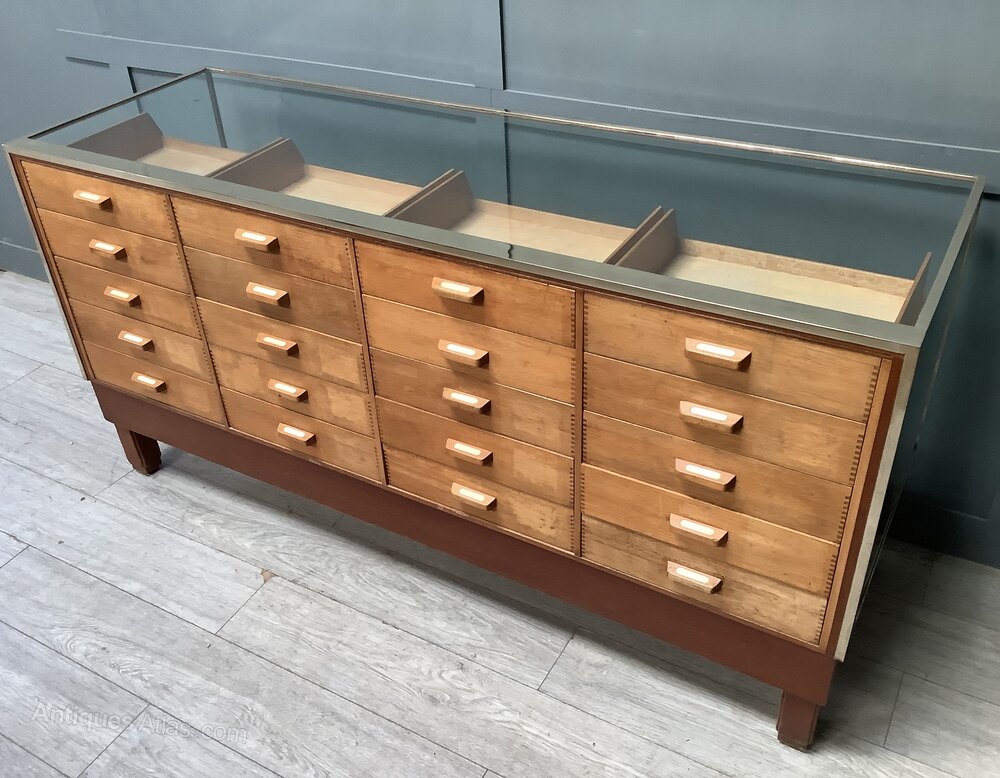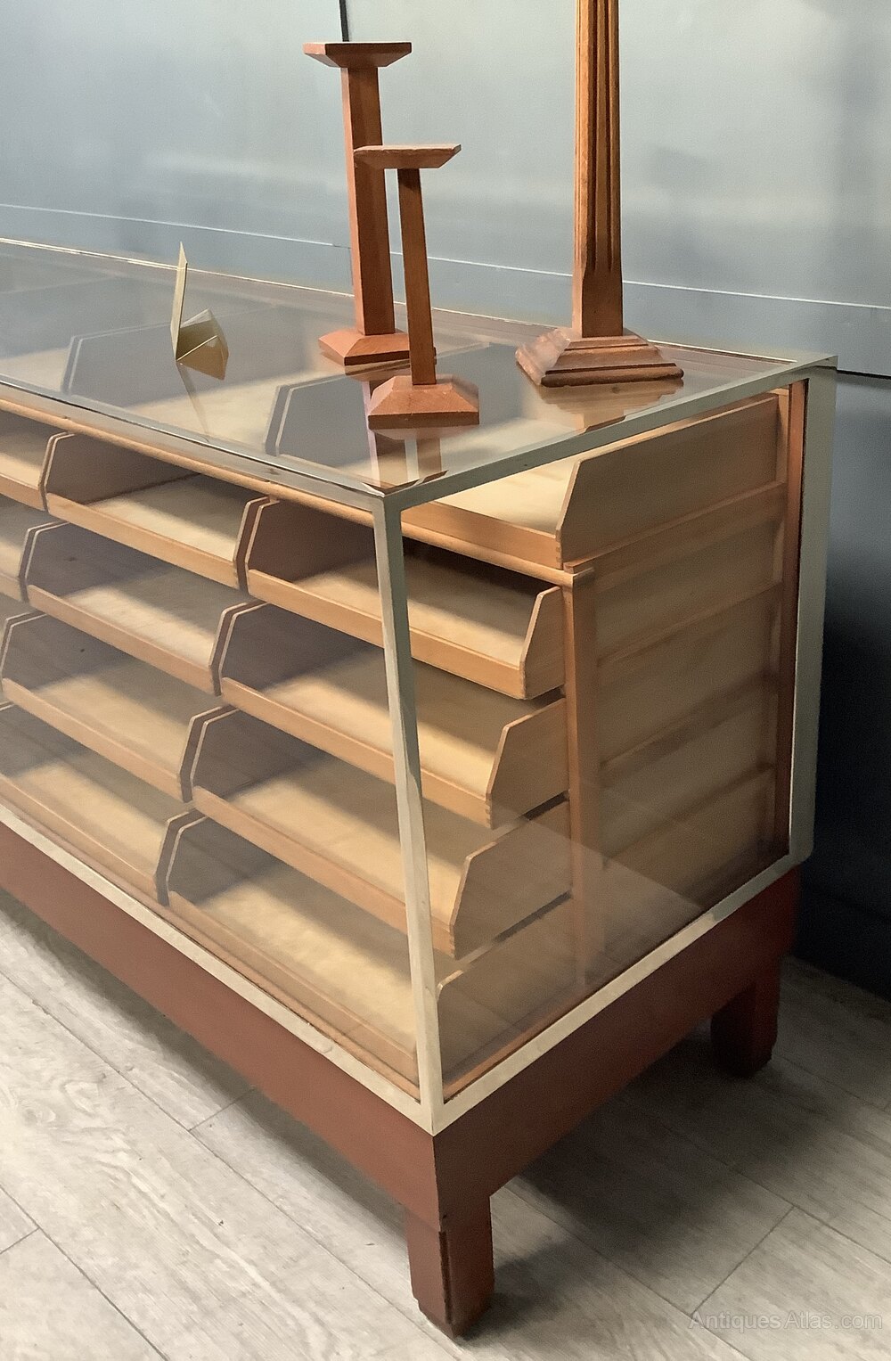 Dating from approximately 1940, the counter boasts a rich, mellow honey-coloured finish that has developed over time. It provides a generous display area in addition to ample storage space, making it highly versatile for both commercial and residential settings. Increasingly, these counters are sought after for use in kitchens, where they offer a practical and stylish alternative to traditional kitchen islands. Their functionality also extends seamlessly into craft rooms, reflecting a growing demand for such vintage pieces.