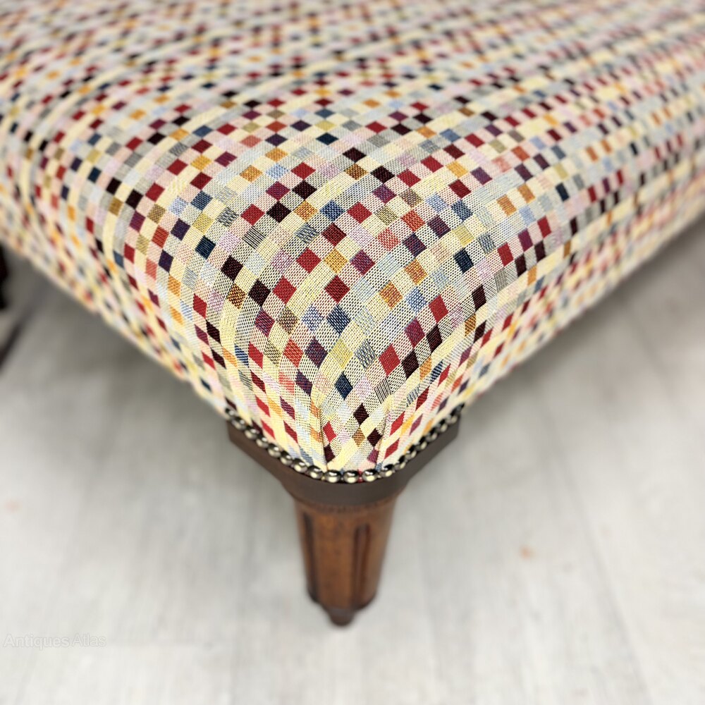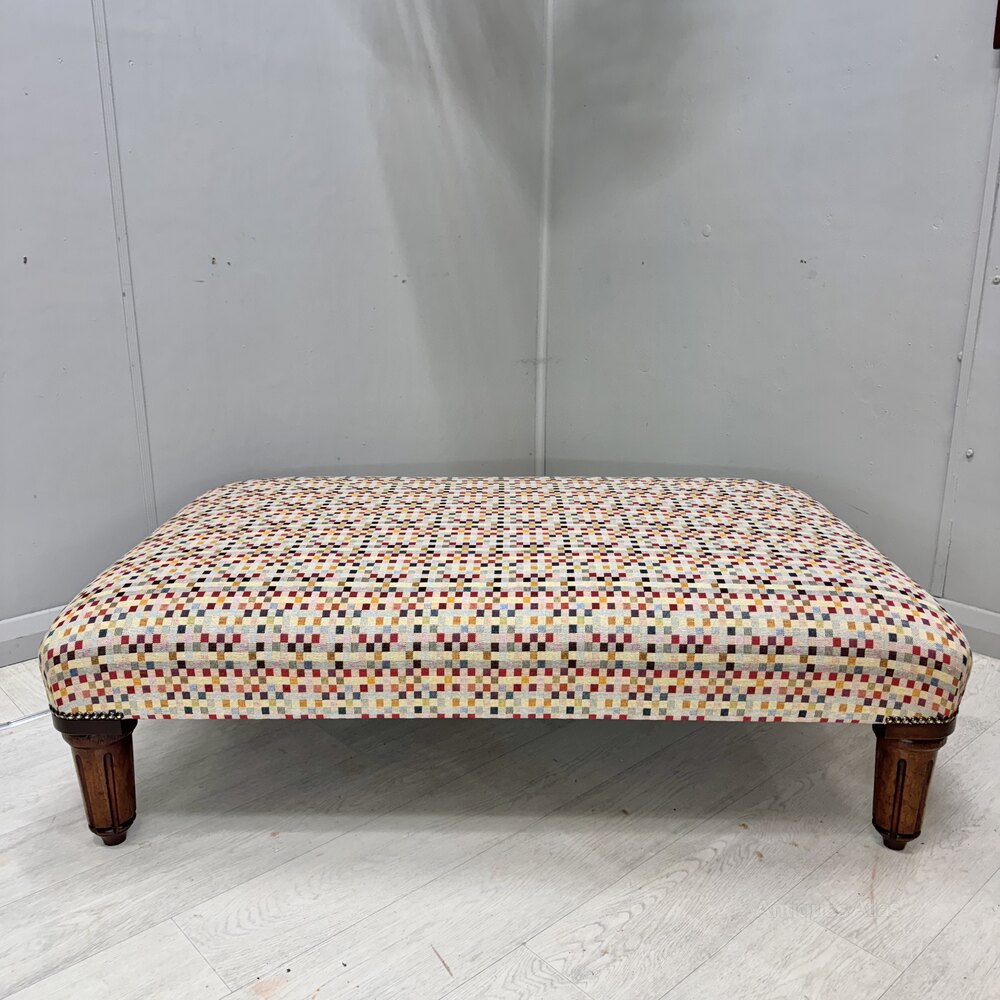 Another large size antique ottoman stool on Georgian mahogany legs, finished with this very decorative geometric pattern fabric, very good quality and a great statement piece.Measuring: