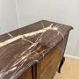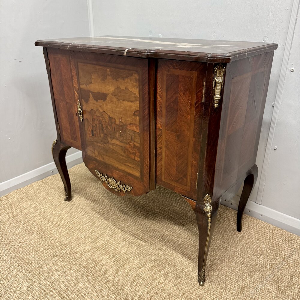 Unusual early 19th century French marble top commode chest with doors opening to a cupboard space, circa 1830.The central door panel is marquetry inlaid with a scene and also mother of pearl, original ormolu mounts and a fantastic original marble top too.