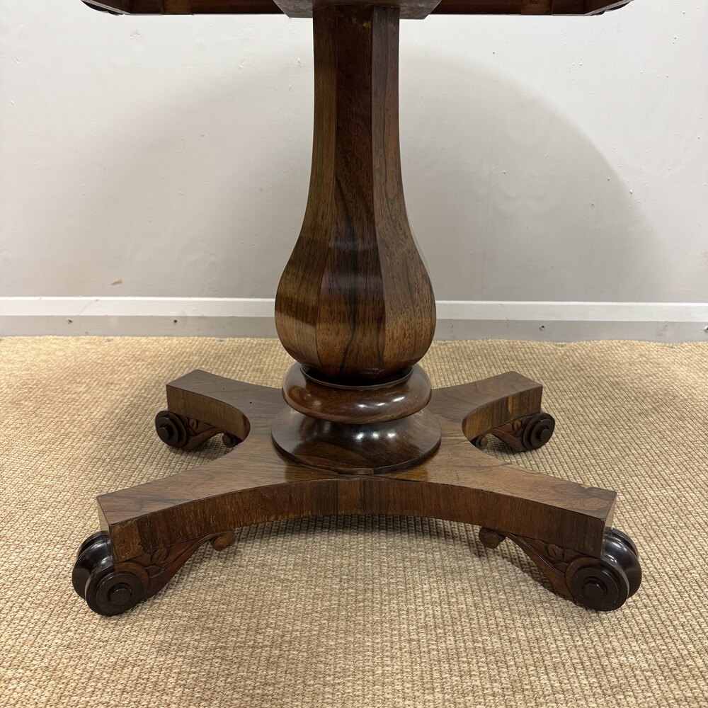 Super quality William IV rosewood centre hall table, circa 1840.The book matched rosewood veneer top stands on the octagonal pedestal raised on a quadriform base.