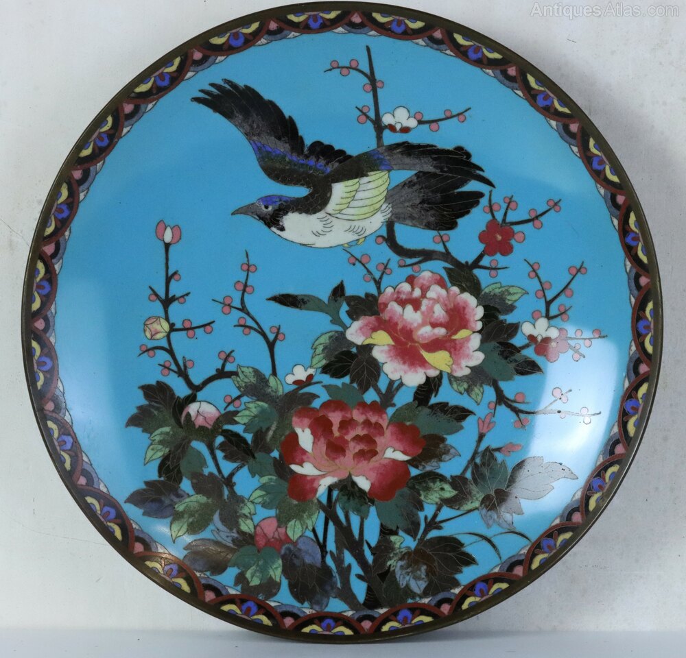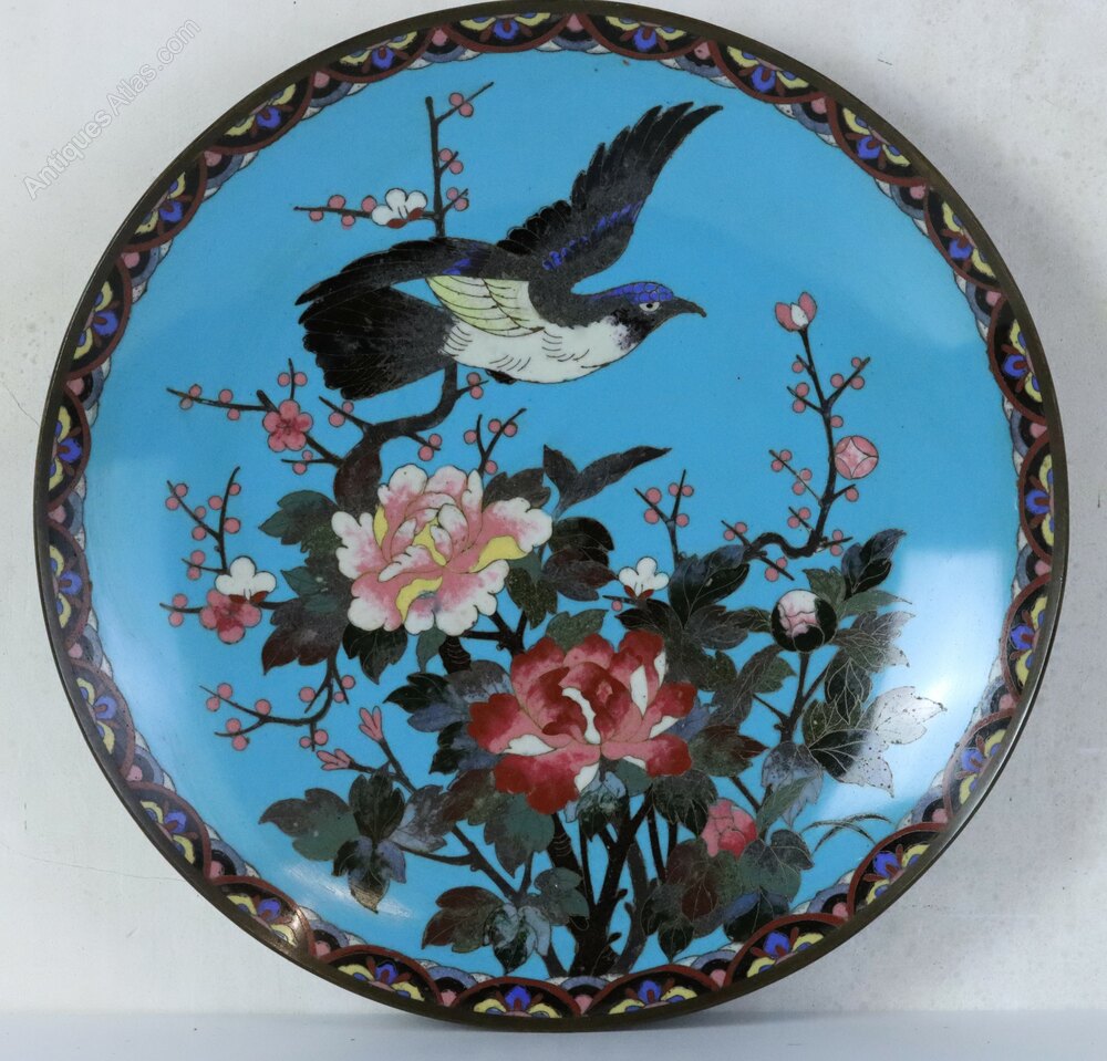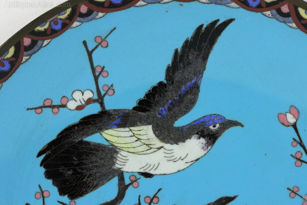 An attractive pair of Japanese cloisonné enamel plates or chargers decorated with birds, peonies and cherry blossom inside decorative Art Nouveau style borders in excellent condition, Meiji Period circa 1900.Dimensions: Diameter 30.5 cm (12 inch), Height 4.0 cm
