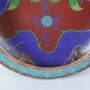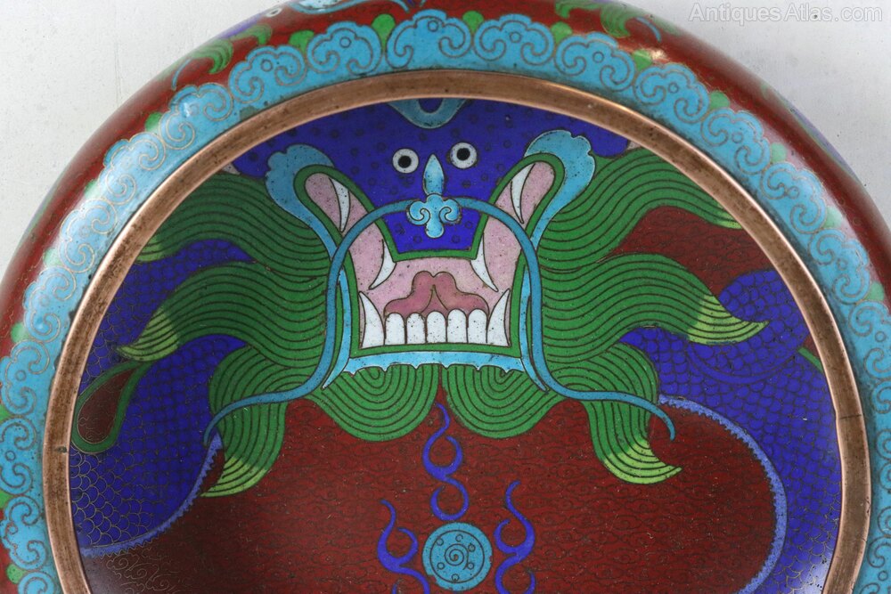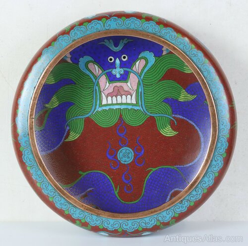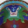 A relatively large Chinese Qing dynasty cloisonne brush bowl colourfully decorated with dragons and bearing a four character mark on the underside in excellent condition.The outside of the bowl depicts four dragons flying over water and chasing burning pearls, while a single large dragon surrounding a burning pearl dramatically decorates the interior. The combination of blue-bodied dragons with green whiskers on a terracotta red background is a relatively rare colourway compared to the more common yellow-bodied dragons on a black background.