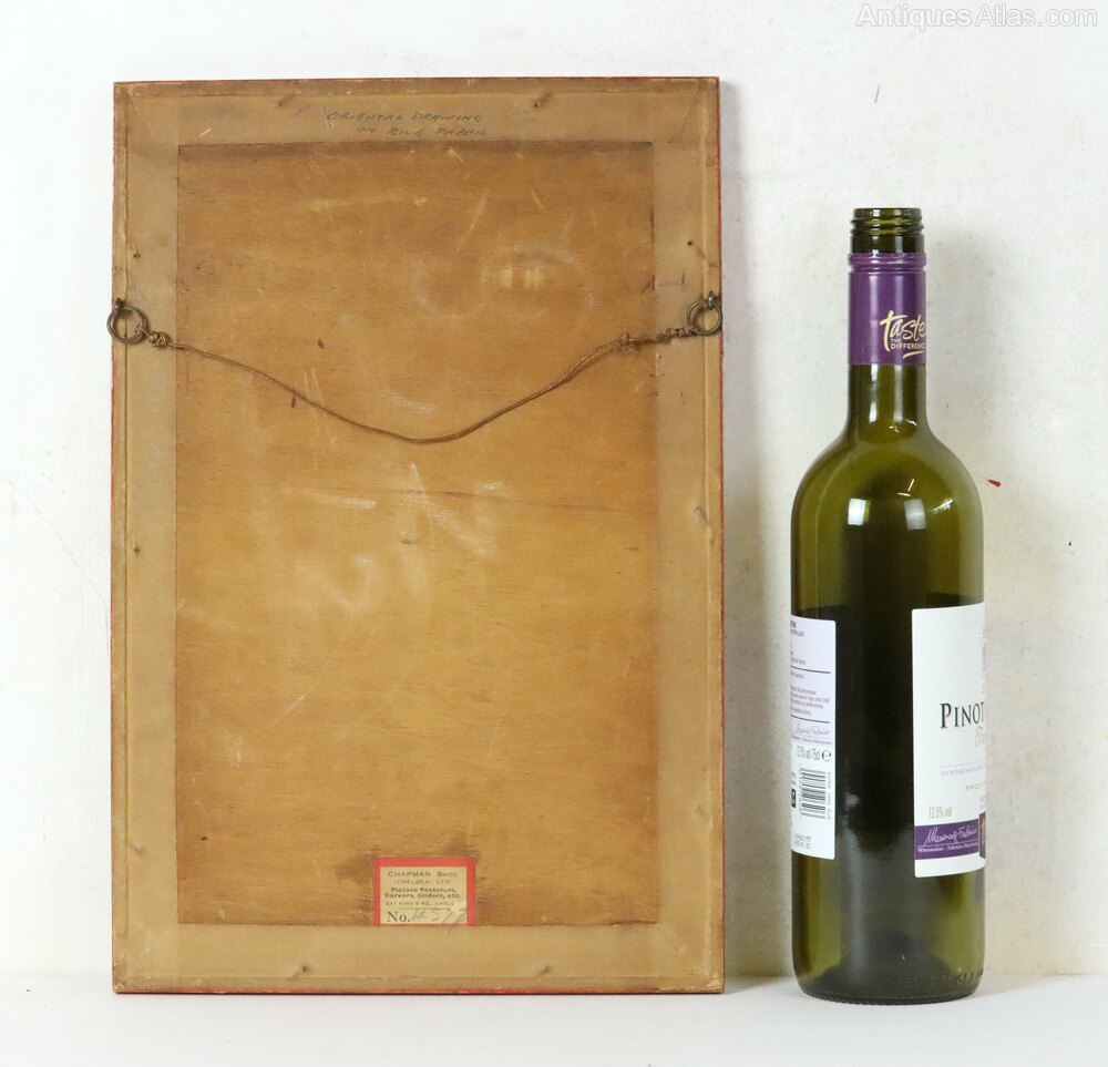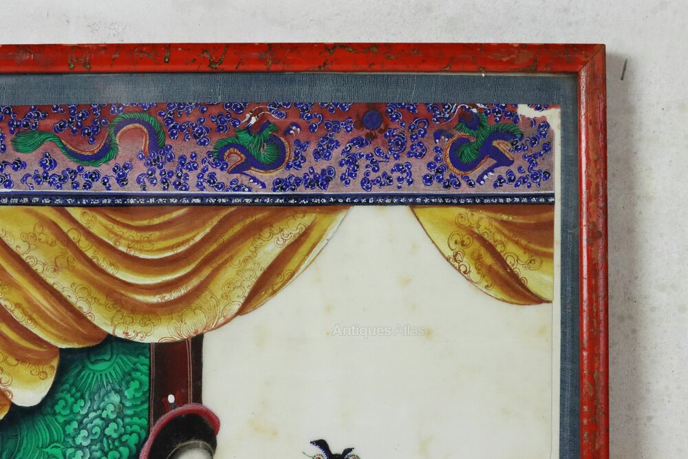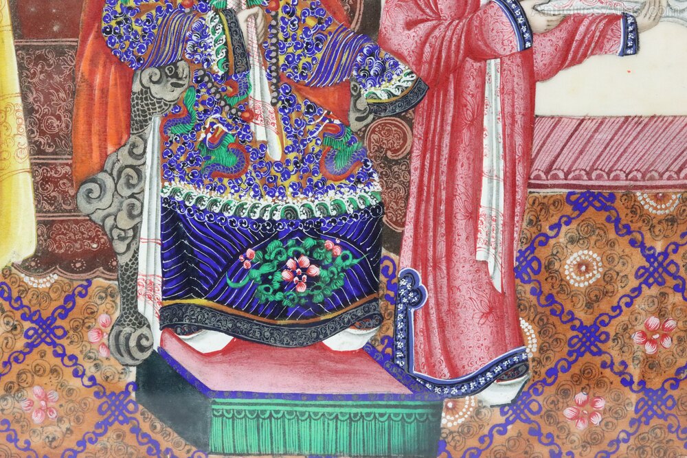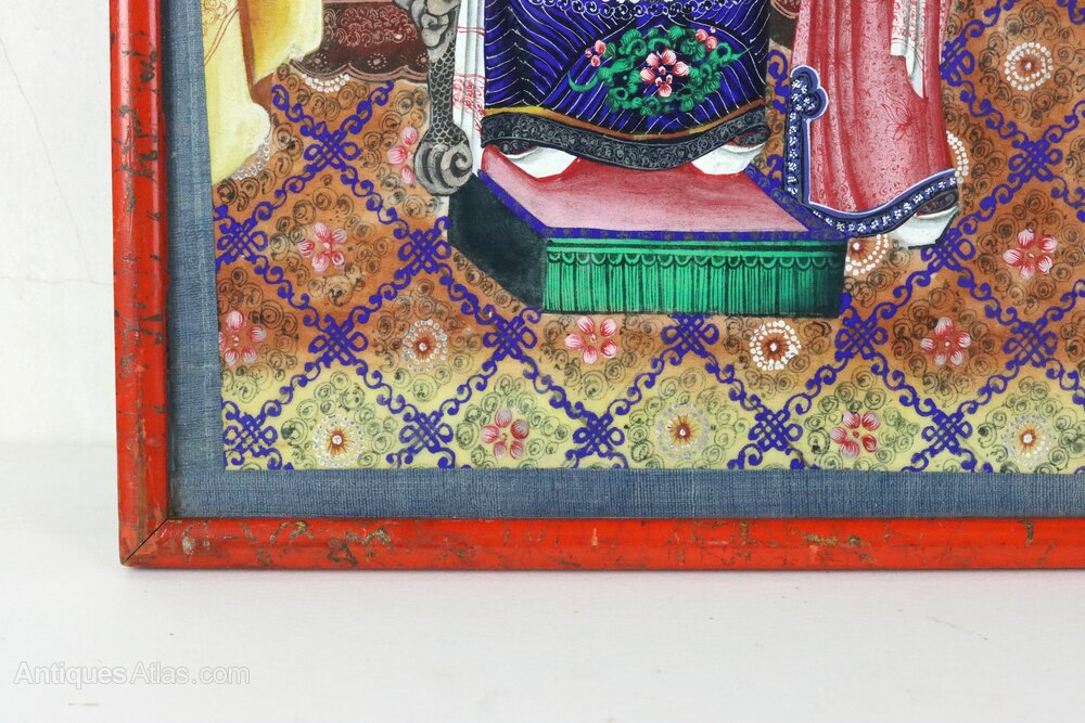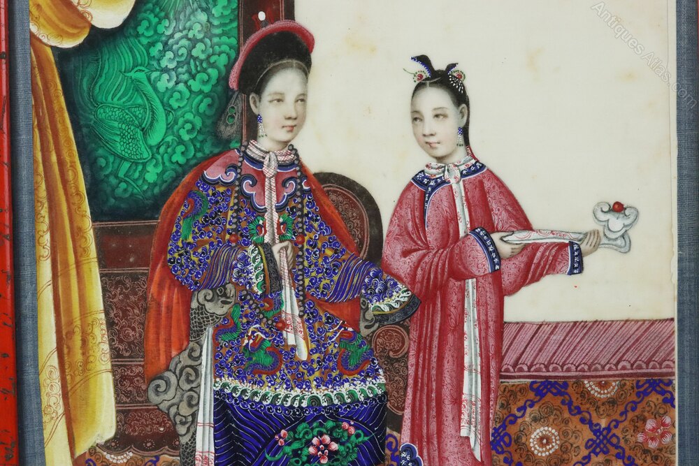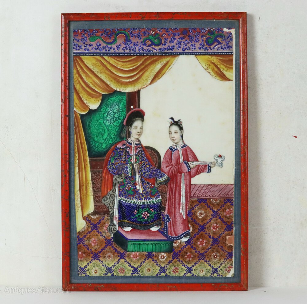 Superb 19th century Chinese pith gouache watercolour painting of an Empress with a young attendant from the Qing Dynasty in wonderful condition and in an attractive (possibly contemporary) red lacquered frame. The detail in the painting is astounding, particularly in the depiction of the costumes which appear on paper almost as sumptuous as the real thing. The artist's attention to detail extends to the carpet and wall decorations which are all beautifully executed.Dimensions: Frame Height 35.5 x Width 24 cm x Depth 1.2 cm