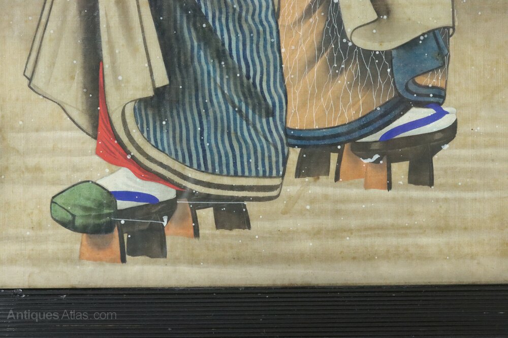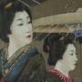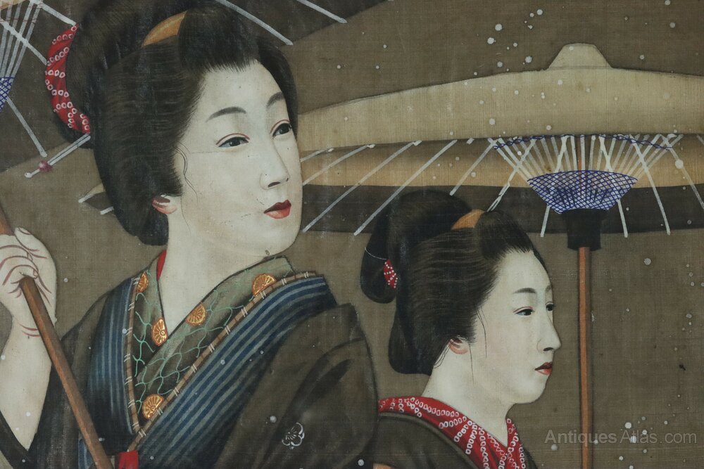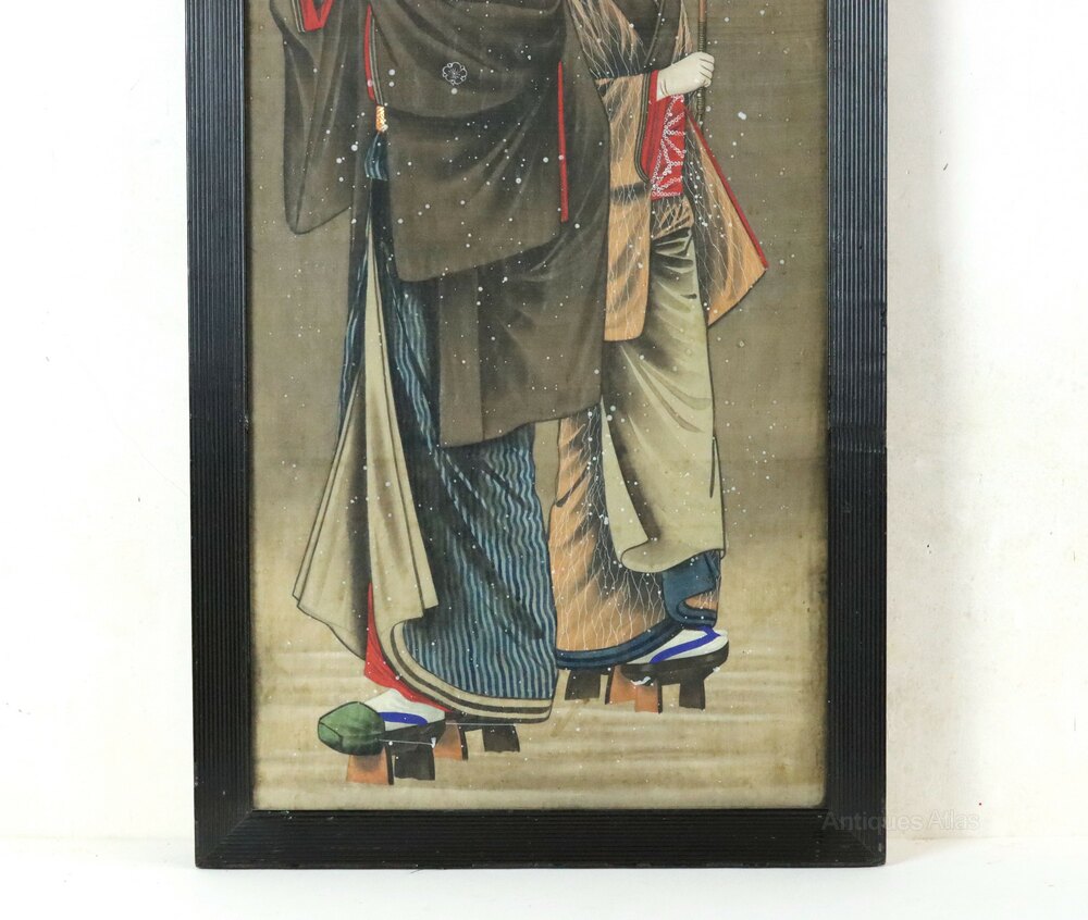 A superbly executed large Japanese Meiji Period gouache painting on silk of two geishas in traditional dress holding umbrellas to keep off the falling snow. It is in its original late 19th/early 20th century reeded ebonised frame and original glass.The painted white faces of the geishas, the elegant styling of their hair and their elaborate kimonos and platformed sandals are all beautifully rendered by the artist.
