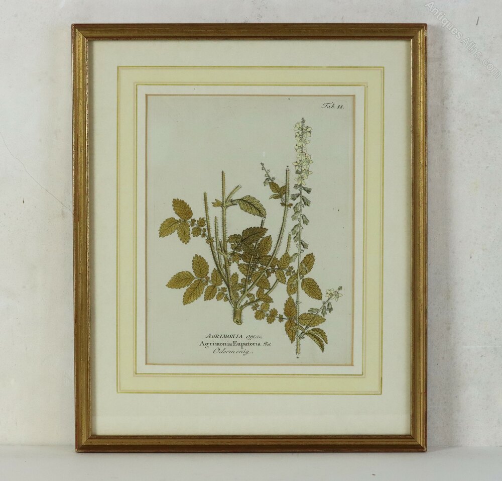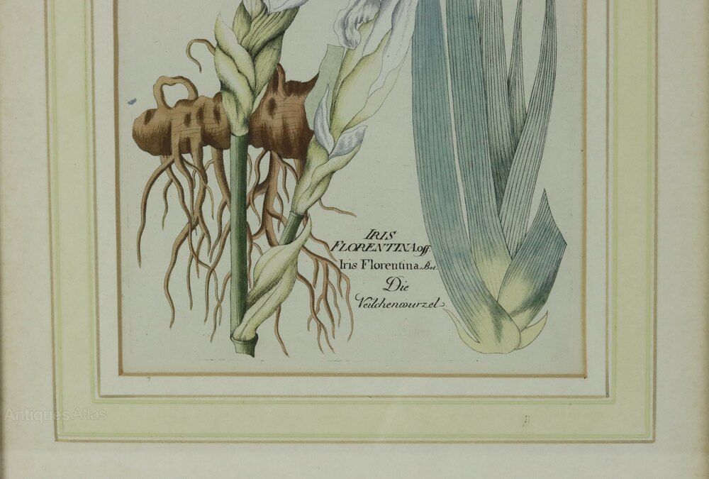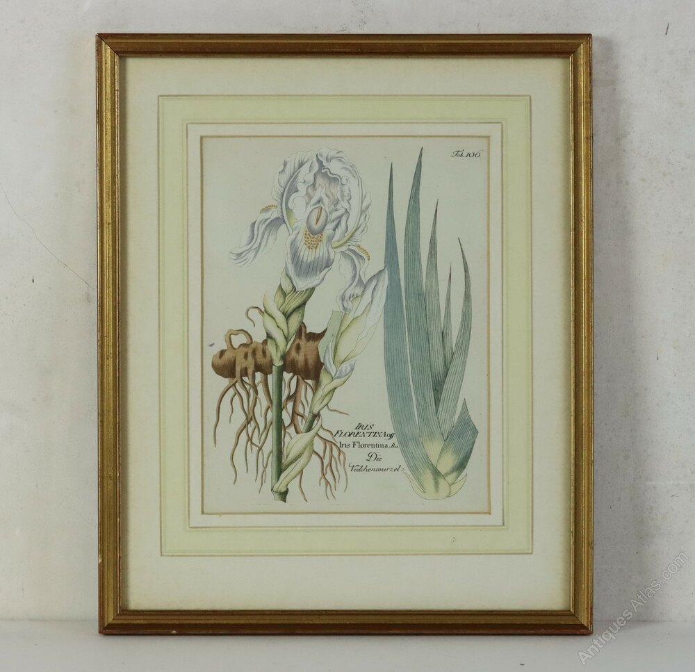 A set of three original hand-coloured copperplate engravings from Ferdinand Bernhard Vietz’s "Icones Plantarum", published between 1800 - 1822, presented in gilt frames & ready to hang.Plate 106 Iris florentina - Florentine Iris or Flag
