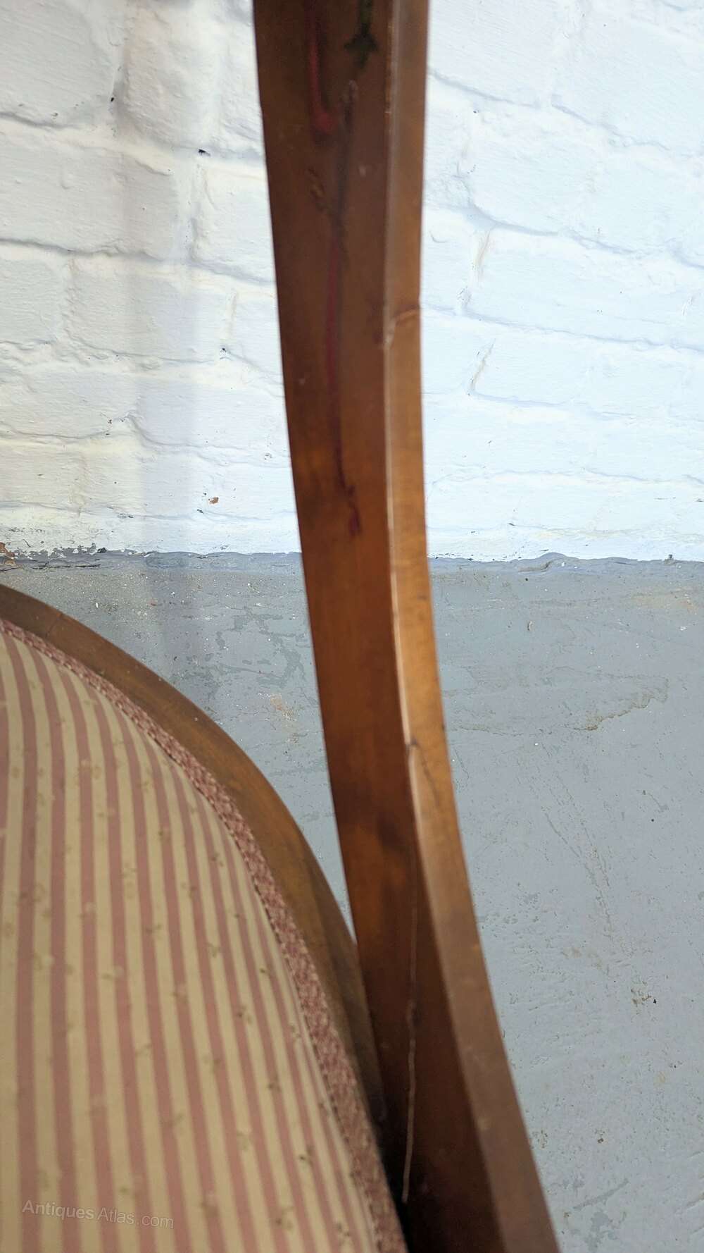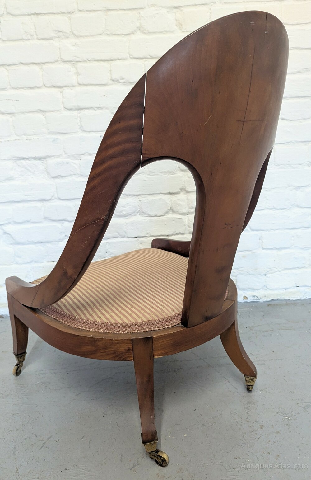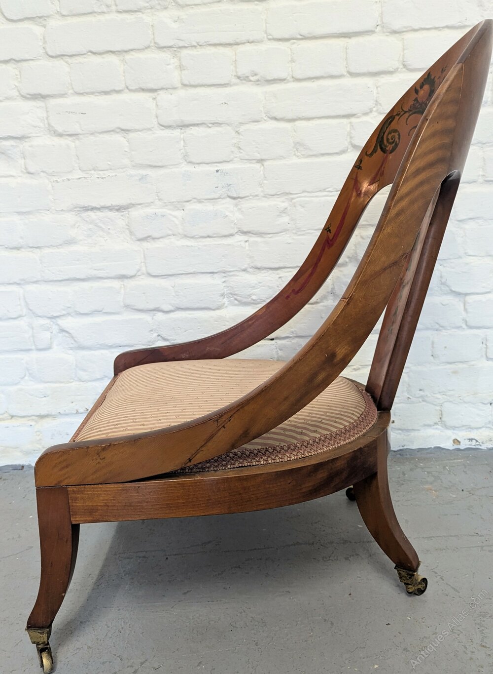 A Regency polychrome satinwood spoon backed Klismos chair having had two breaks in one arm and the top arm joint with a noticeable gap. In used condition and measuring 54 cm x 68 x 85 c1810.DateEarly 19th Century