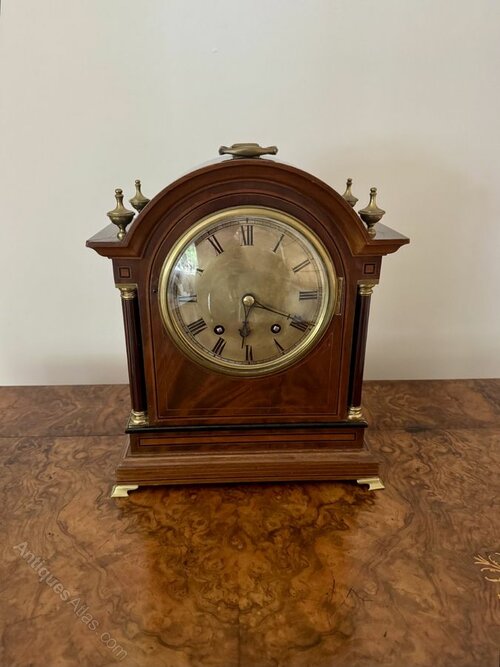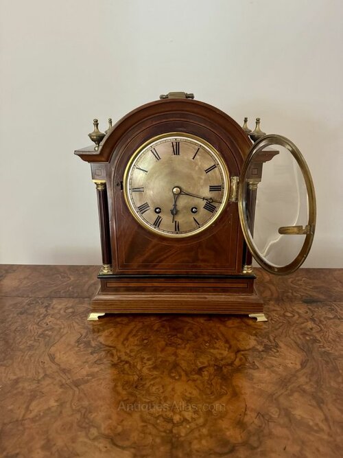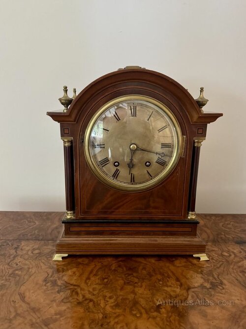 Wonderful quality antique 19th century bracket clock, having a quality 19th century bracket clock, with an arched shaped mahogany case with a carrying handle to the top, brass finials and brass mounted columns to the sides of the of the large circular 6inch dial with Roman numeral's and black ornate hands, with a quality eight day movement striking on two gongs, raised on shaped brass feet.All clocks get serviced prior to delivery.