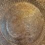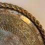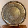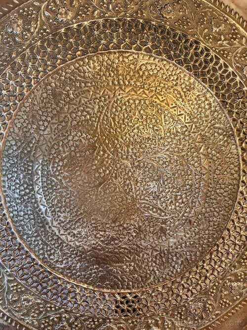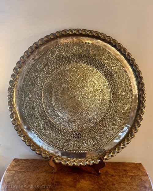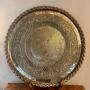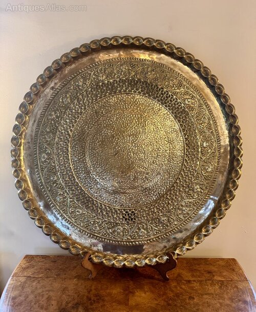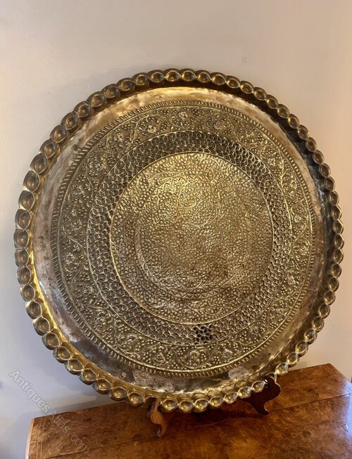 Impressive quality large antique mixed metal tray, having a quality large antique mixed metal tray, having embossed detail decorated with trailing grapes, leaves and vines, with a pierced panel within a repeating scalloped shaped edge.H 3cm