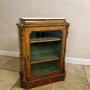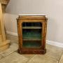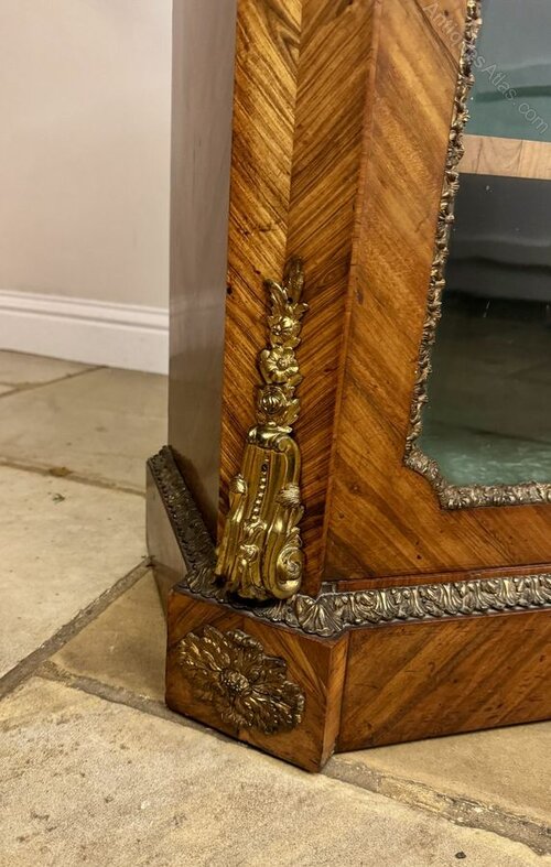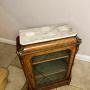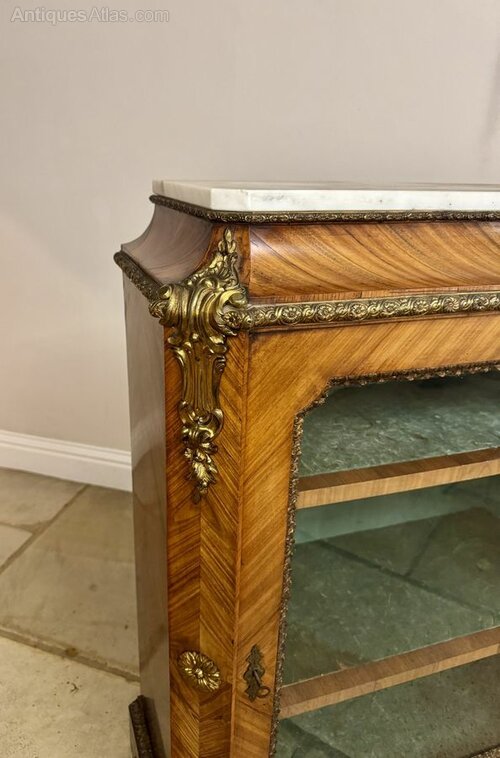 Fantastic quality 19th century marble topped pier cabinet, having a quality antique Victorian kingwood pier cabinet with a white top above a single glazed door opening to reveal a green fitted interior with two shelves raised on a plinth shaped base. Highly decorated with ormolu mounts on the corners, edges and feet giving it an elegant look & the kingwood having a polished finish. This is a fantastic quality antique 19th century pier cabinet in good condition with working lock and key.H 103cm