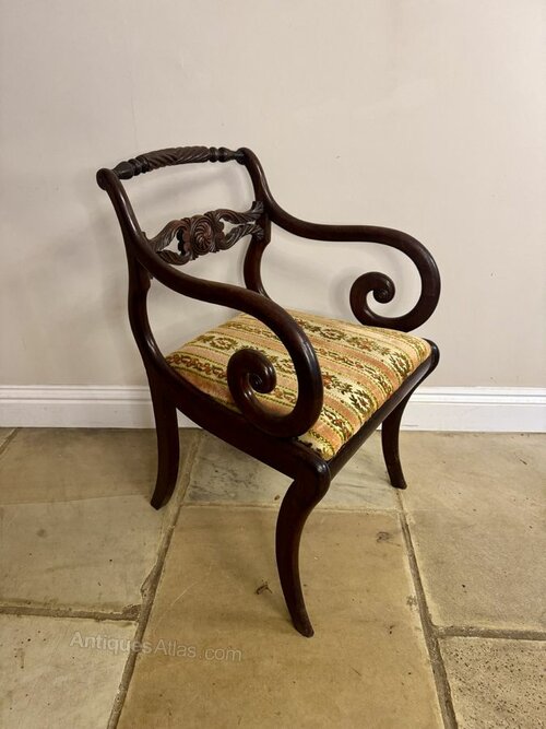 Superb quality antique Regency set of six dining chairs, having a quality set of six Regency rosewood dining chairs consisting of two carvers and four chairs, the backrest having a turned top rail above a quality carved middle rail with a central rosette motif surrounded by scrolls, above a drop in upholstered seat in a patterned fabric with vertical stripes in gold, green, pink and red tones, standing on sabre legs.The Carvers having carved scroll arm rests.