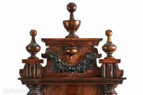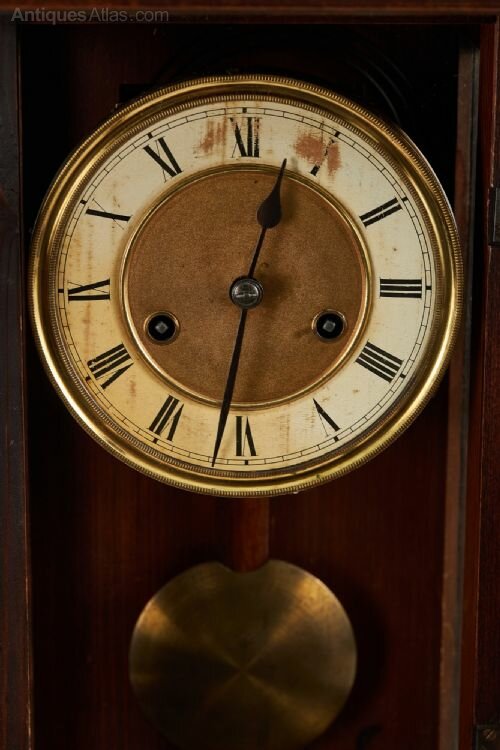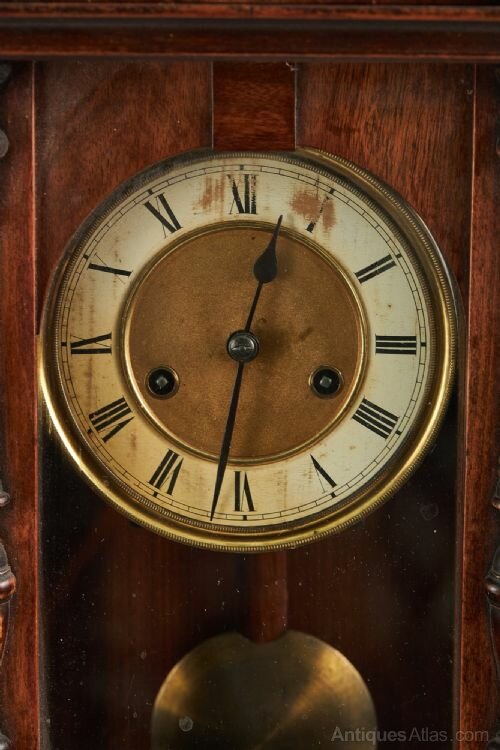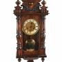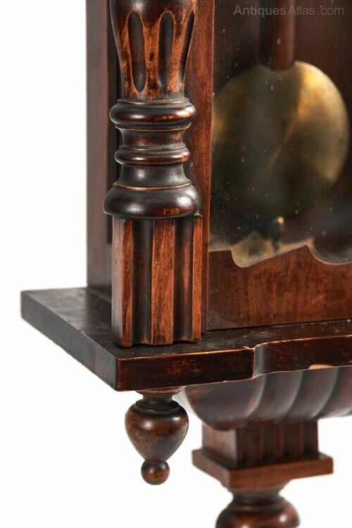 Antique Walnut Wall Clock, having a quality carved walnut case with original turned finials, reeded columns and solid walnut carvings and glazed and walnut door opening to reveal a circular enamel and brass clock face with roman numerals. Twin train movement. Complete with key.All clocks are serviced prior to delivery.
