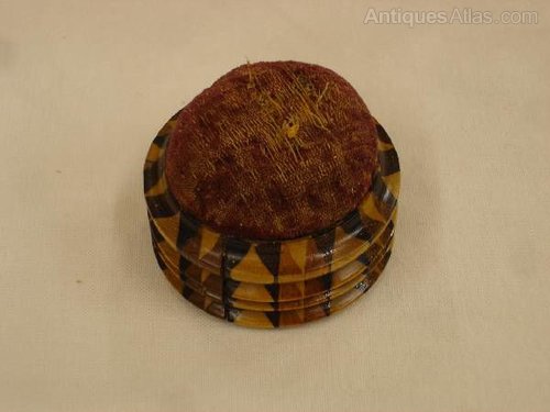 Tunbridgeware pin cushion, a excellent example of stickware. The original cushion and material cover are showing some signs of wear.1 3/4" diameter 1 1/2" high