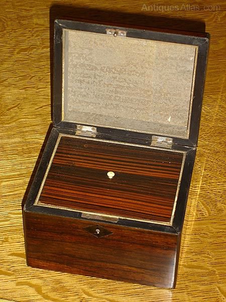 This single tea caddy has a Pewter inlay which spells "TEA" in the domed top. The escutcheon and edge banding are made of Ebony whilst the interior lid is a scumble imitation of Rosewood. Unfortunately there is no key with this box.H 4" x 4¾" x W 5½