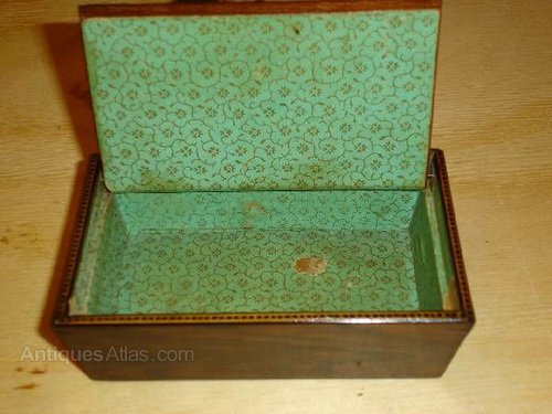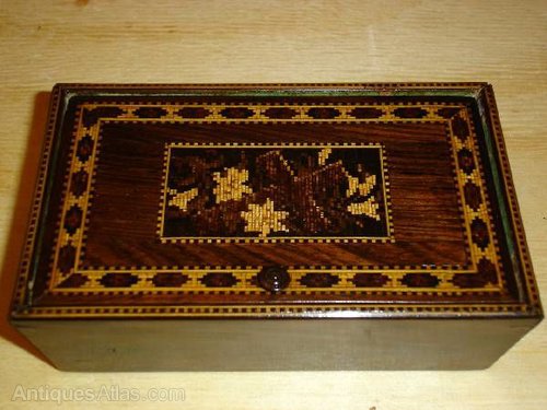 Rare tundridge ware scene of a cross intertwined with flowers, on a rosewood veneered pin hinged box, the interior showing original green paper lining.5 1/2" x 3 1/2" x 1 3/4"