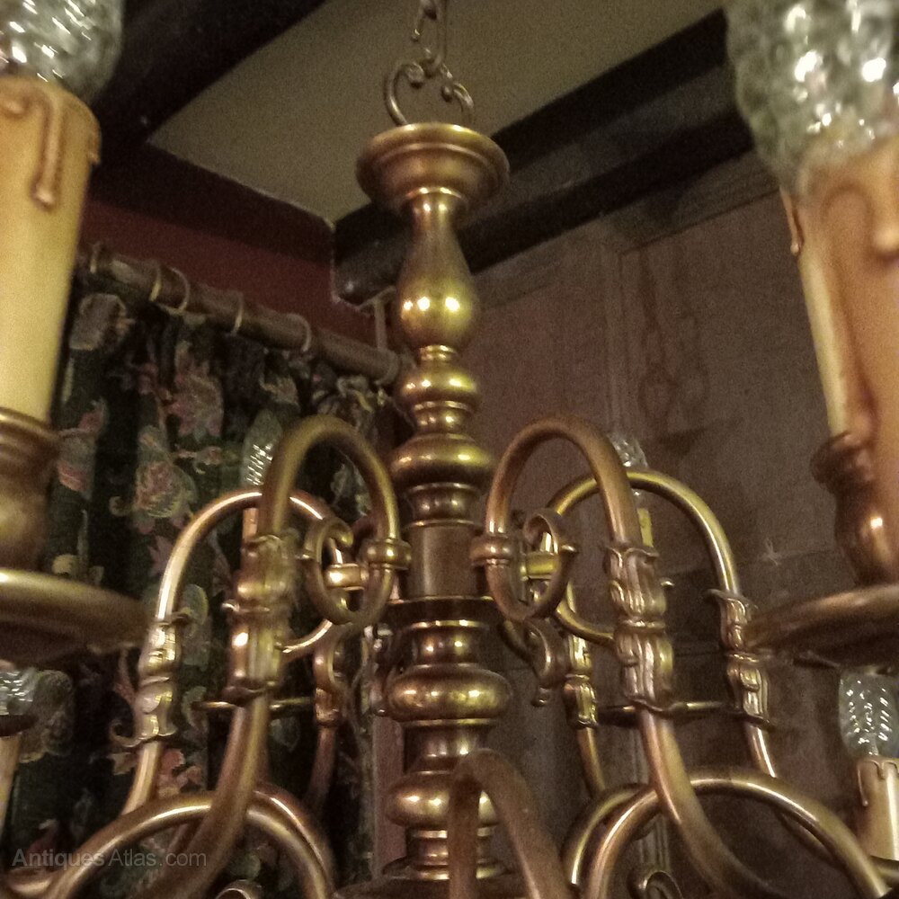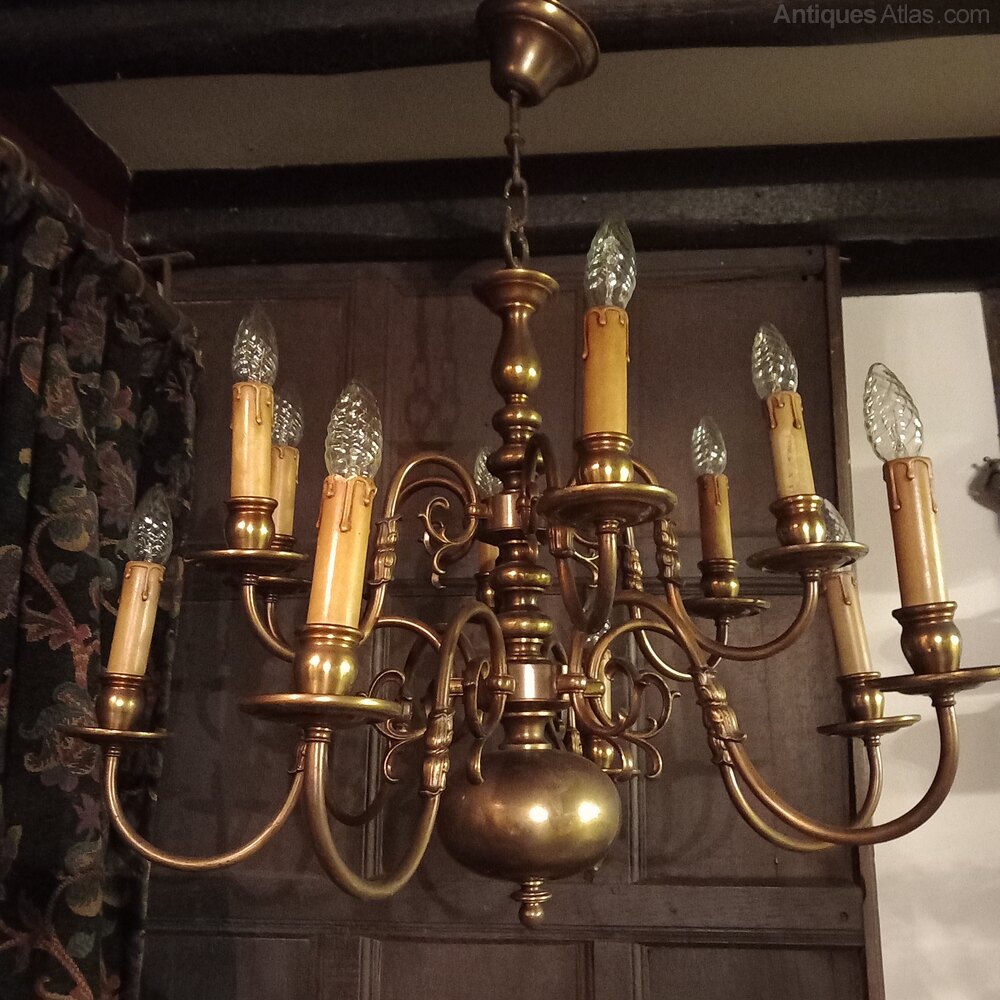 A good compact 12 Light 2 tier brass Flemish chandelier. This chandelier will be fully rewired , pat safety tested and fitted with new candle tubes or candle drips. The frame will be lightly cleaned and waxed preserving the colour and patina.The dimensions are 71 cm wide x 80 cm minimum drop.We can increase the drop by adding more chain.