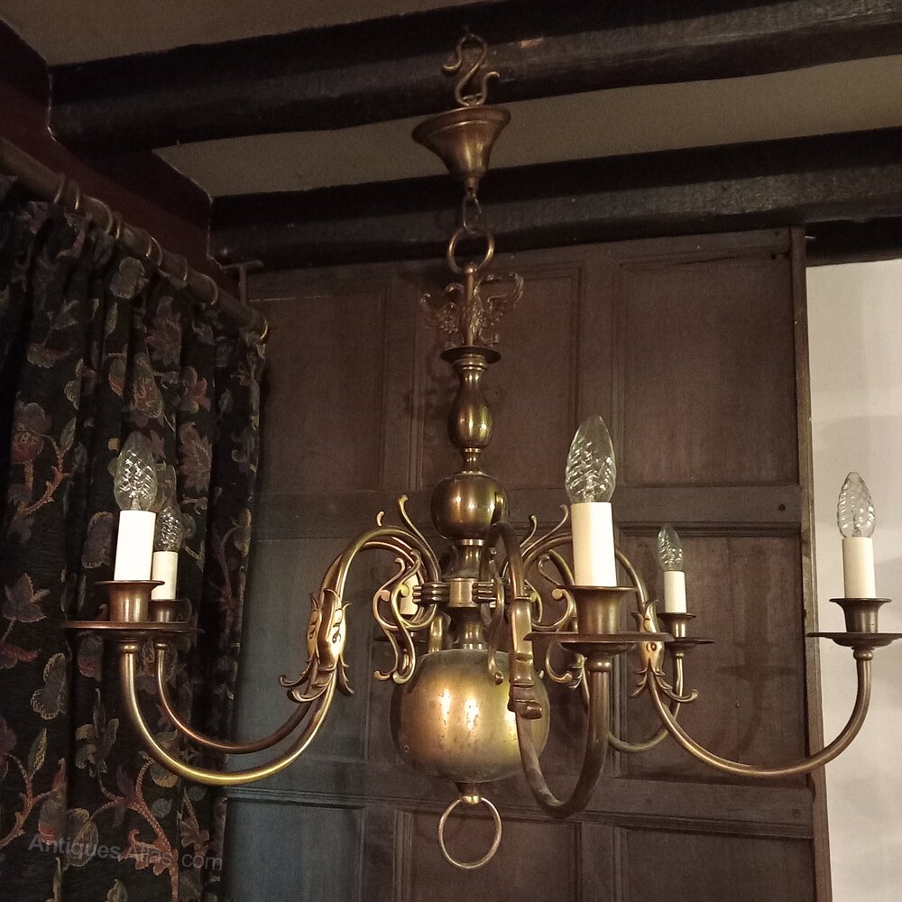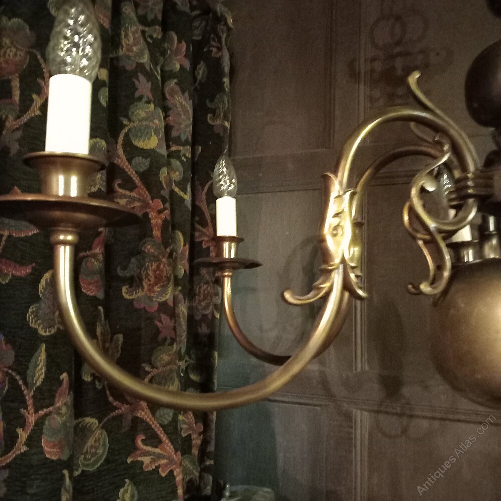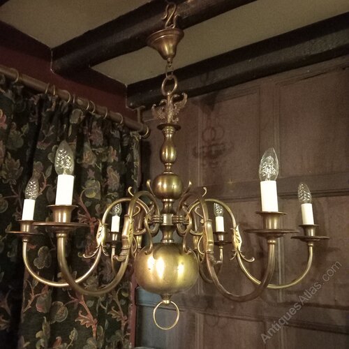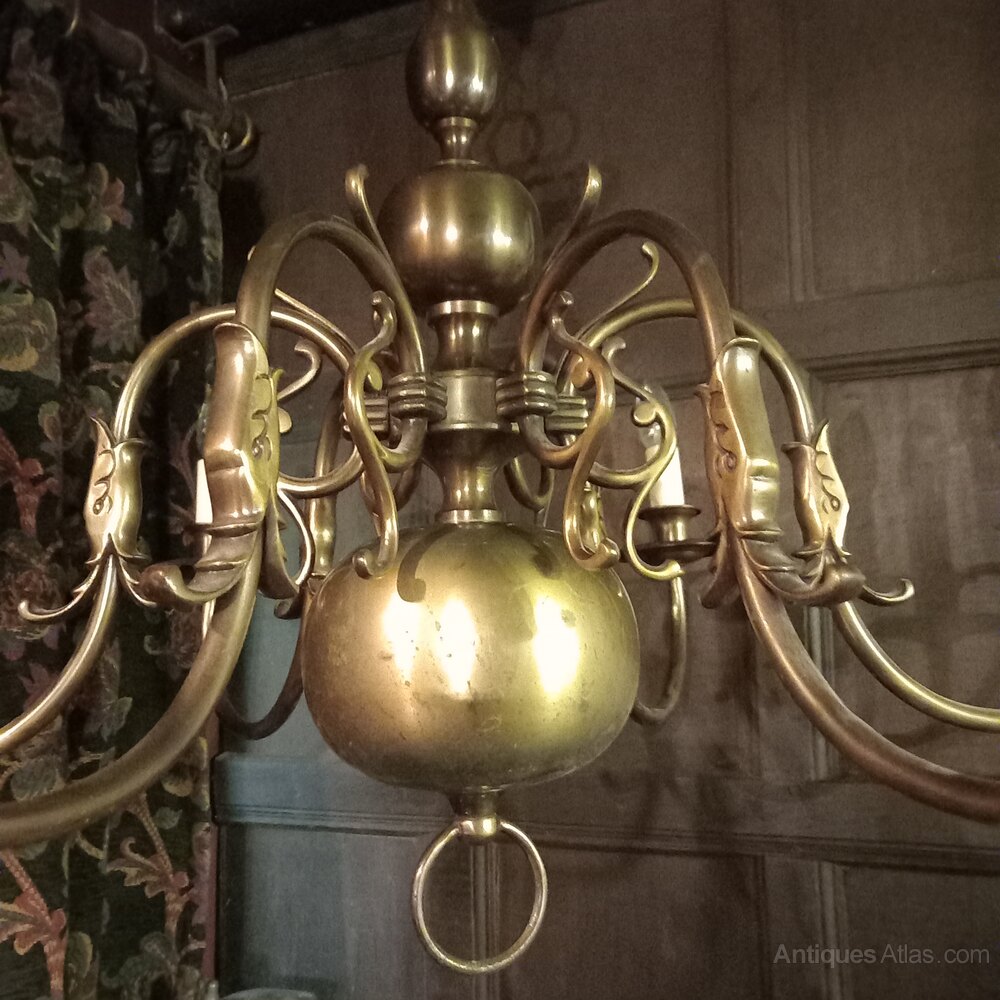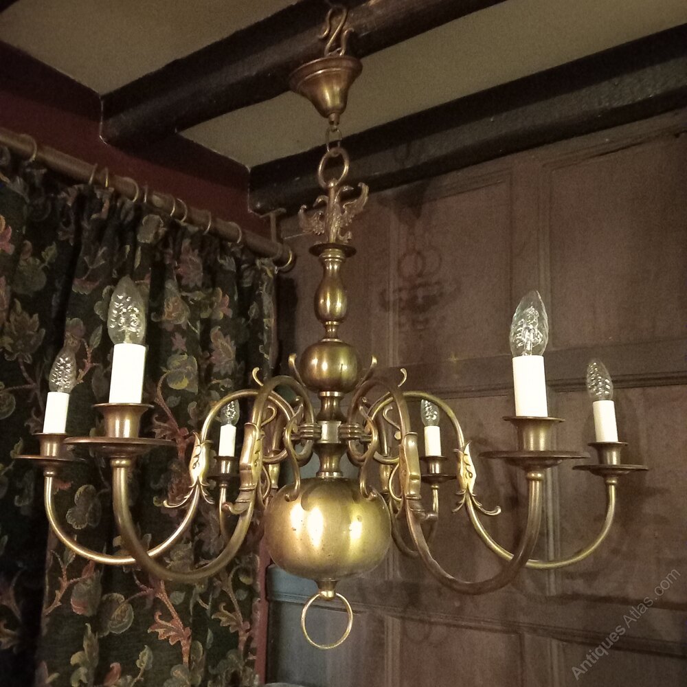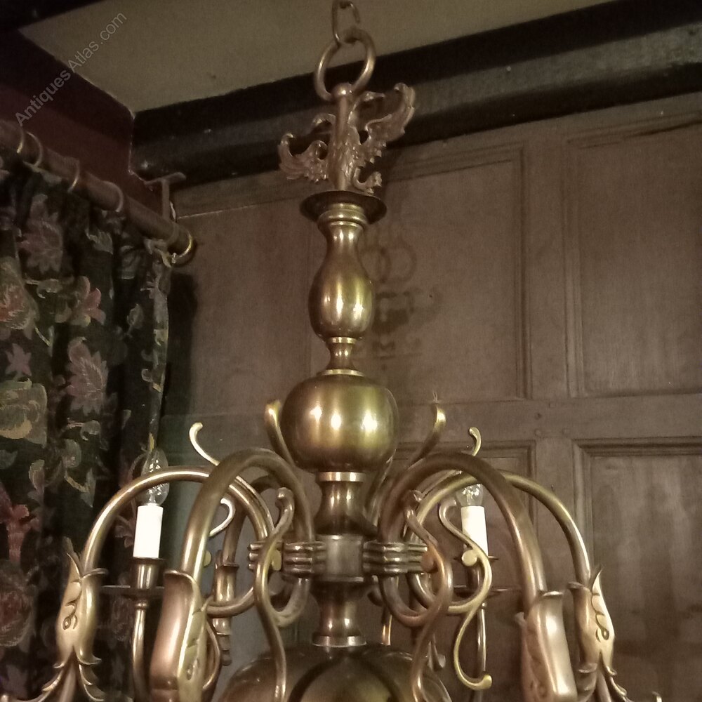 A good large and wide antique brass Flemish chandelier, this chandelier has a good colour and patina which we will lightly clean and wax or if preferred it can be polished to a more shiny finish. it will be fully rewired and pat safety tested.The dimensions are 85 cm wide x 88 cm min drop , we can increase the drop by adding more chain if required.