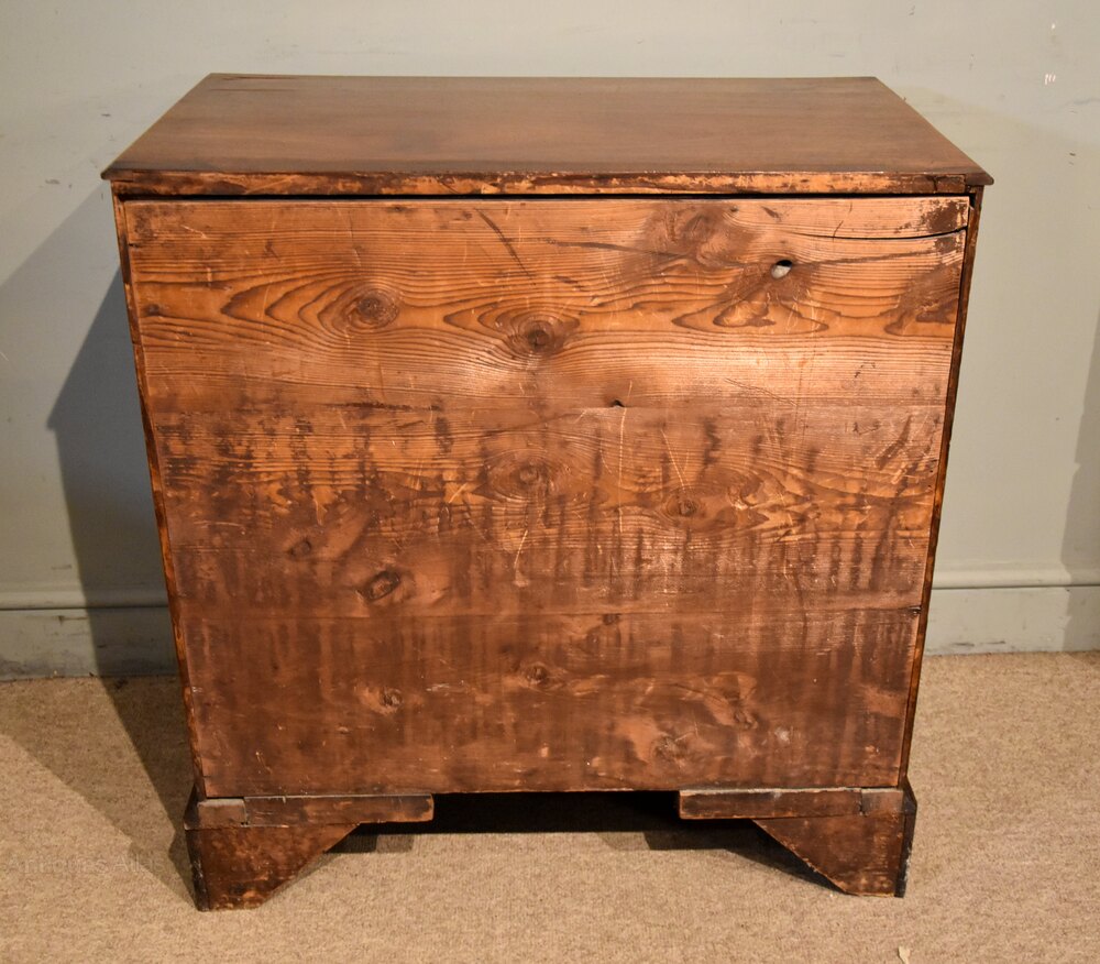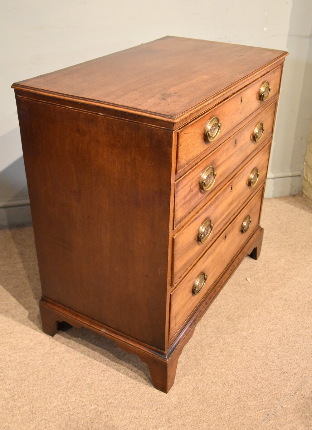 A SMALL (30") GEORGE III MAHOGANY CHEST OF DRAWERS OF A WONDERFUL MELLOW FADED COLOUR. COMPLETELY ORIGINAL THROUGHOUT, EXCEPT FOR REPLACEMENT BRASS OVAL HANDLES. .Height 32" 82cm