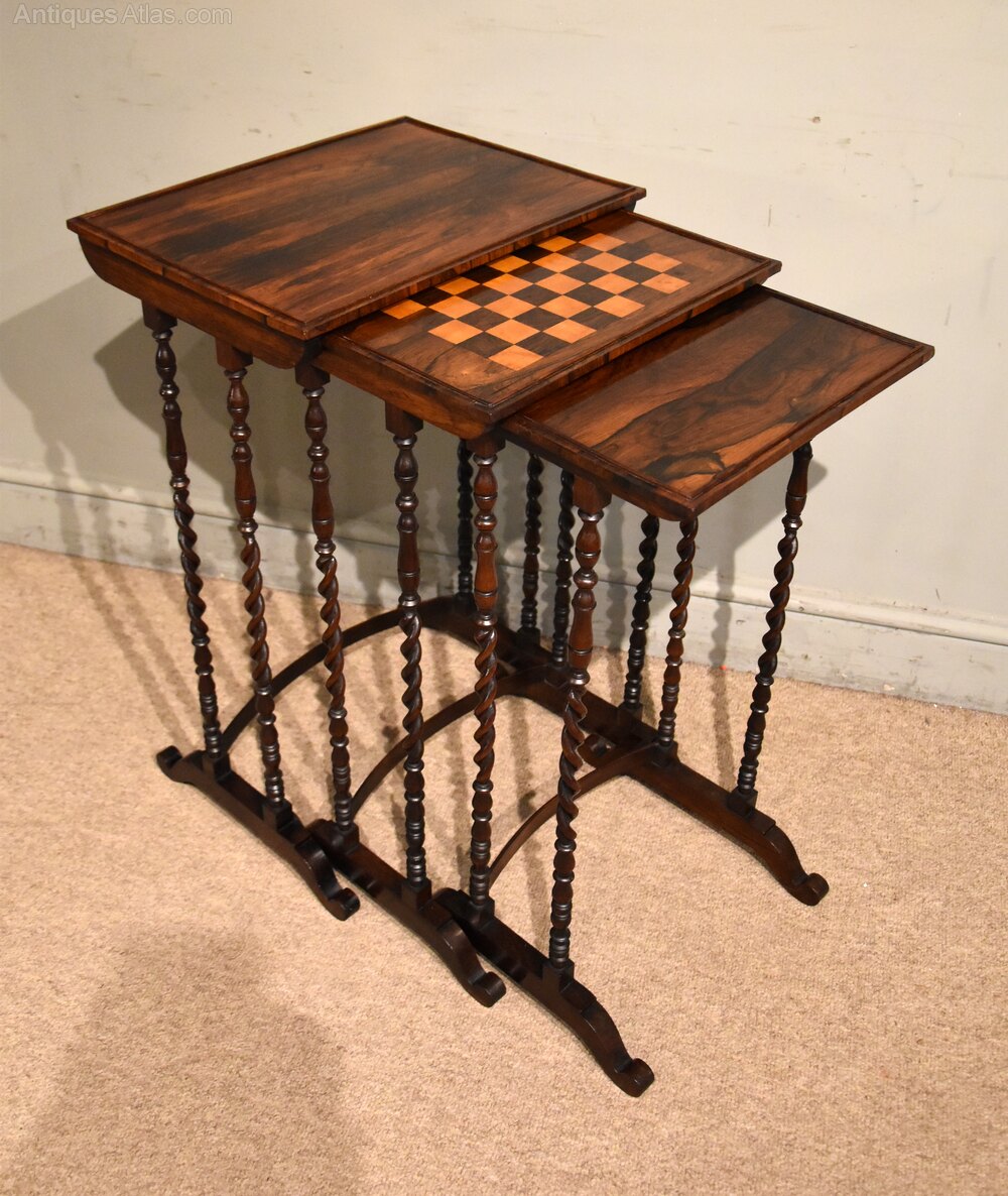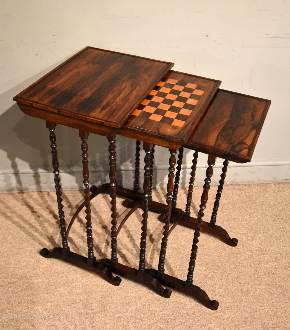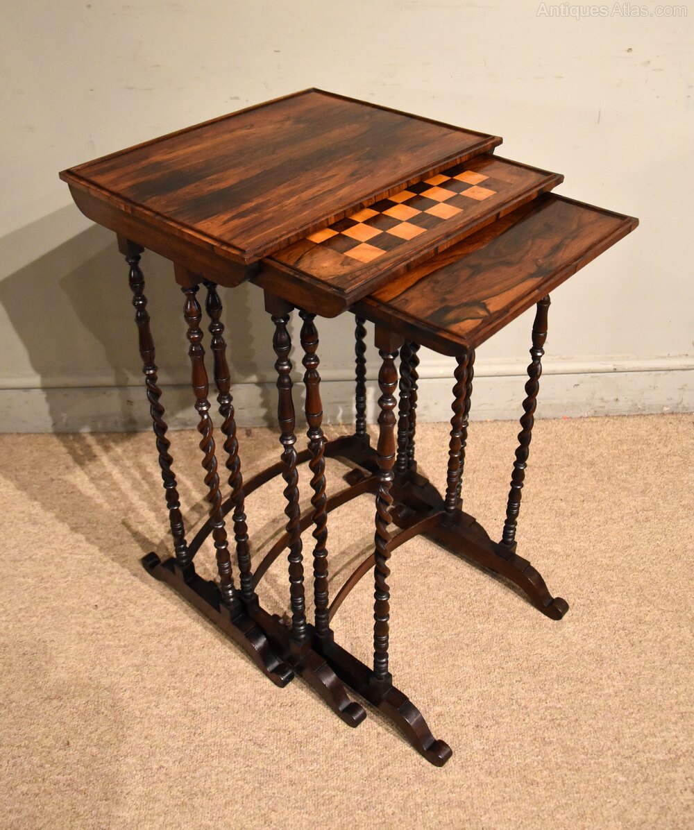 An attractive nest of three Regency period occasional tables in rosewood with a games table raised on unusual superbly turned barley twist supports of stunning rich colour.Dimensions of largest table