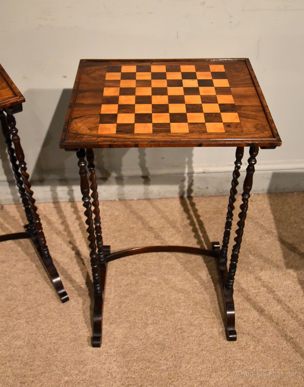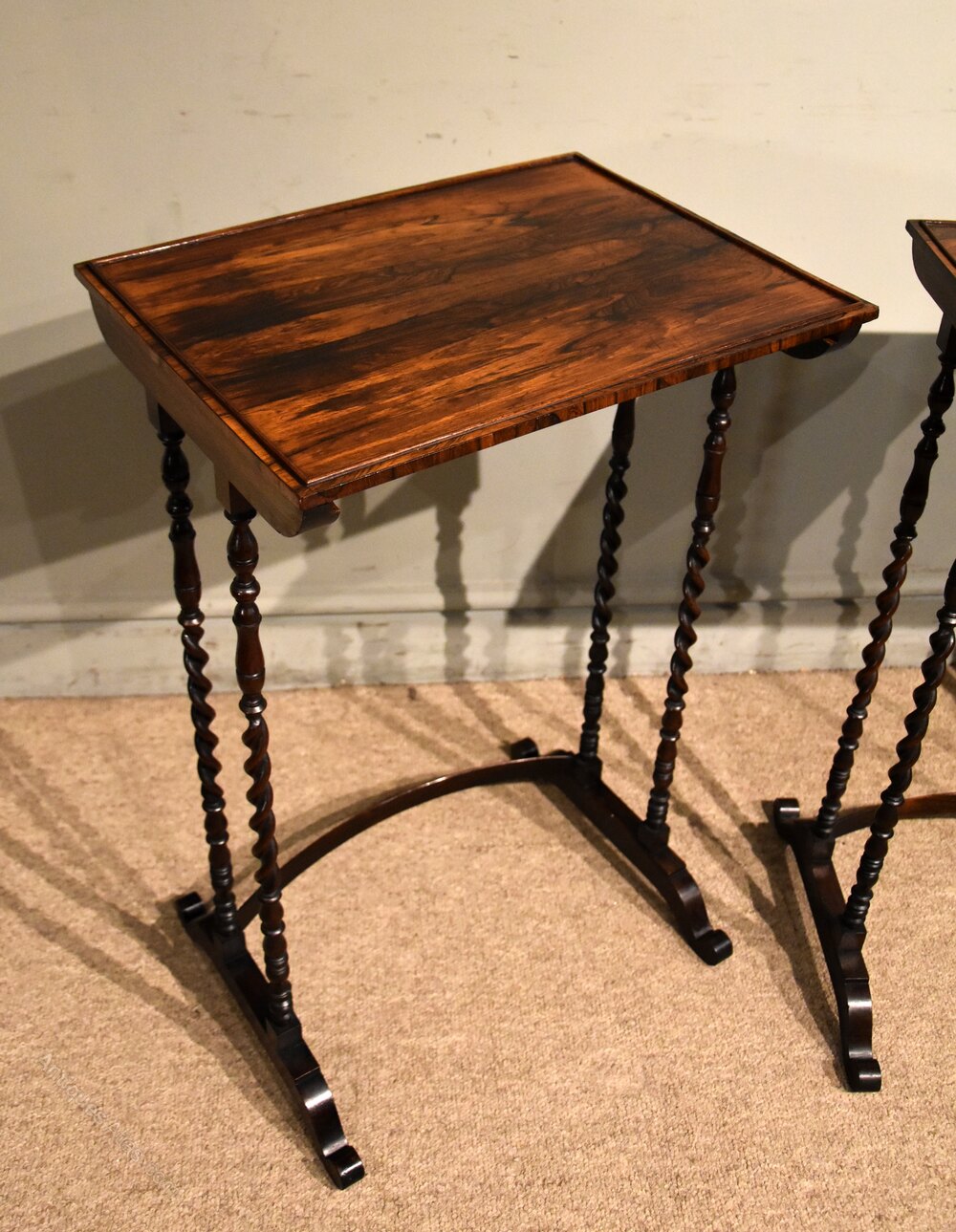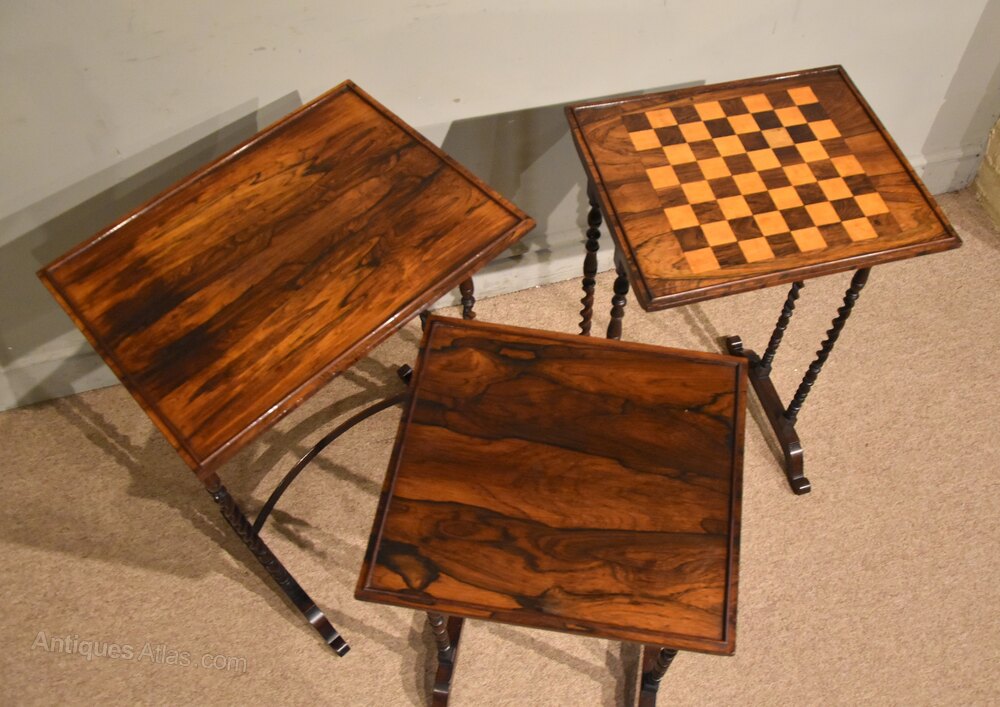 An attractive nest of three Regency period occasional tables in rosewood with a games table raised on unusual superbly turned barley twist supports of stunning rich colour.Dimensions of largest table