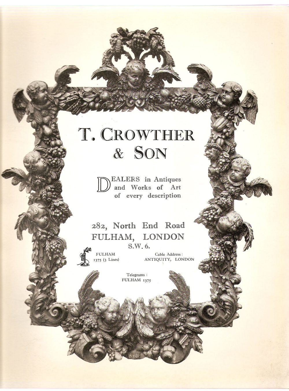 T. Crowther & Son of 282 North End Road, Fulham, London, Catalogue of 1939. 119 pages of Architectual Antiques (Oak Panelling, Mantlepieces, Grates, Interiors, Doors, Mirrors, Carving and Garden Urns, etc.,). Printed Lithographically by William Pollard & Co., Exeter and London.DateGeorge VI :