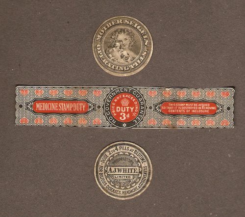 Set of 3 Medicine Box Congreve Security Printed and Engraved Labels of circa `1885. The labels would have been on a small wooden pillbox of 3.5 cms diaminter and 3.0 cms high. The Top label with Engraving of young girl(very prodably an earlier engraving of Charles Heath's Princess Aderlaide) and Bottom label of the Proprietor A J White Ltd.,London, who were the manufacturers of Mother Seiqels Operating Pills. The Congreve Medicine Stamp Duty Revenue label is for 3 Pence Duty. Printers and Engravers unknown to the circular labels.DateLate Victorian :