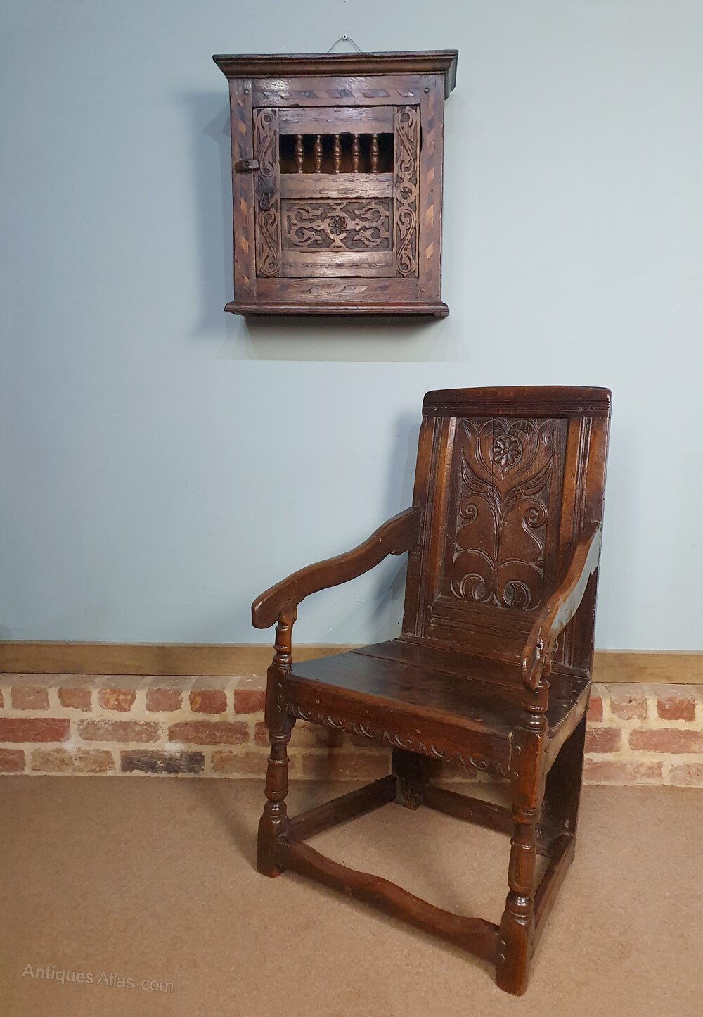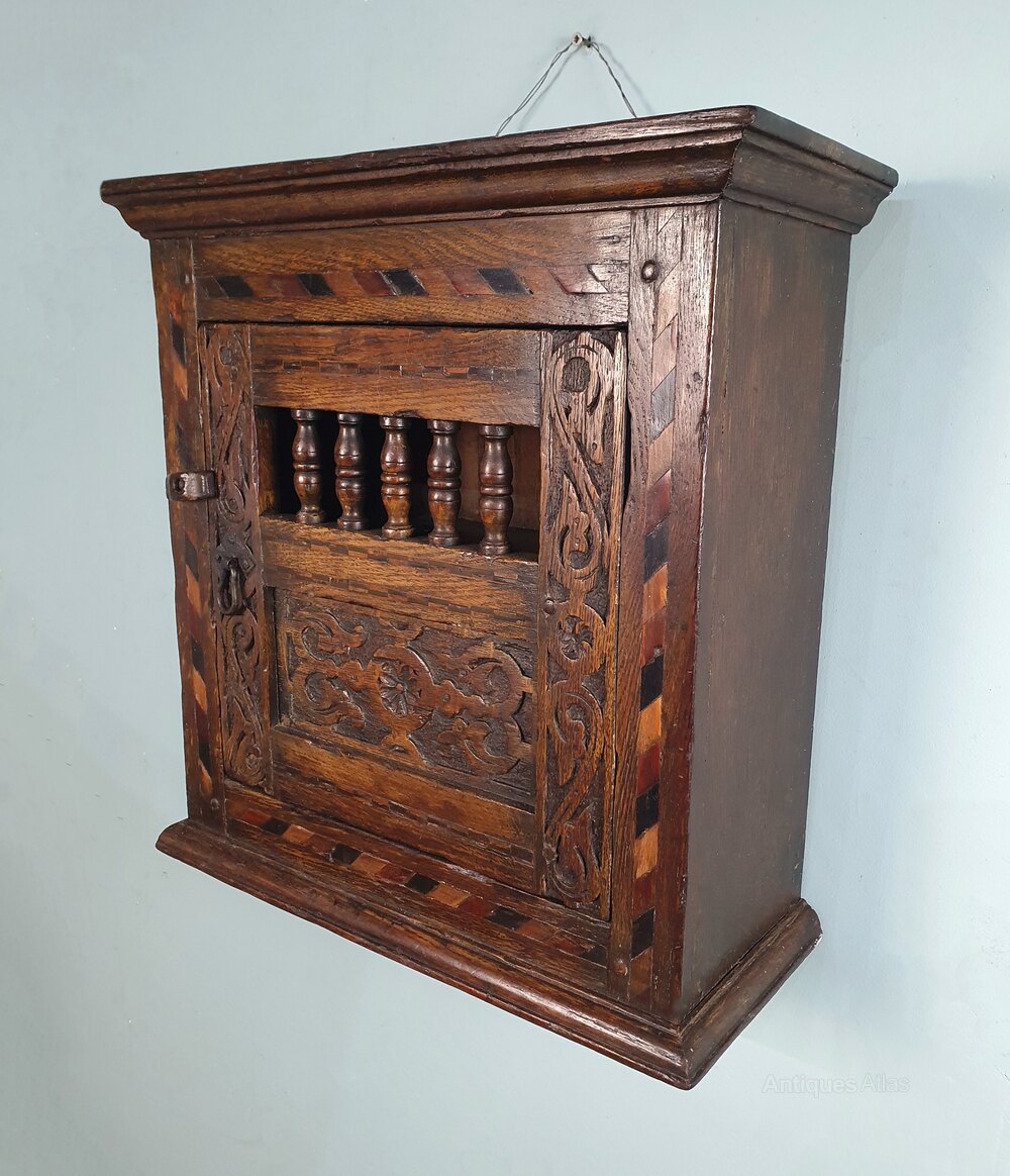 A really lovely small wall hanging cupboard of Queen Anne design with chevron and running band inlays of ebony, walnut and holly, carved foliate S scrolls and beautifully turned spindles with original iron handle and thumb turn lock.In excellent condition throughout, this really looks to have been made in the early 1700s but in my view this was made in around 1850 and is a faithful copy of a Queen Anne livery cupboard, made entirely by hand in solid oak with all the traditional methods of construction, peg jointed and with a lovely colour.