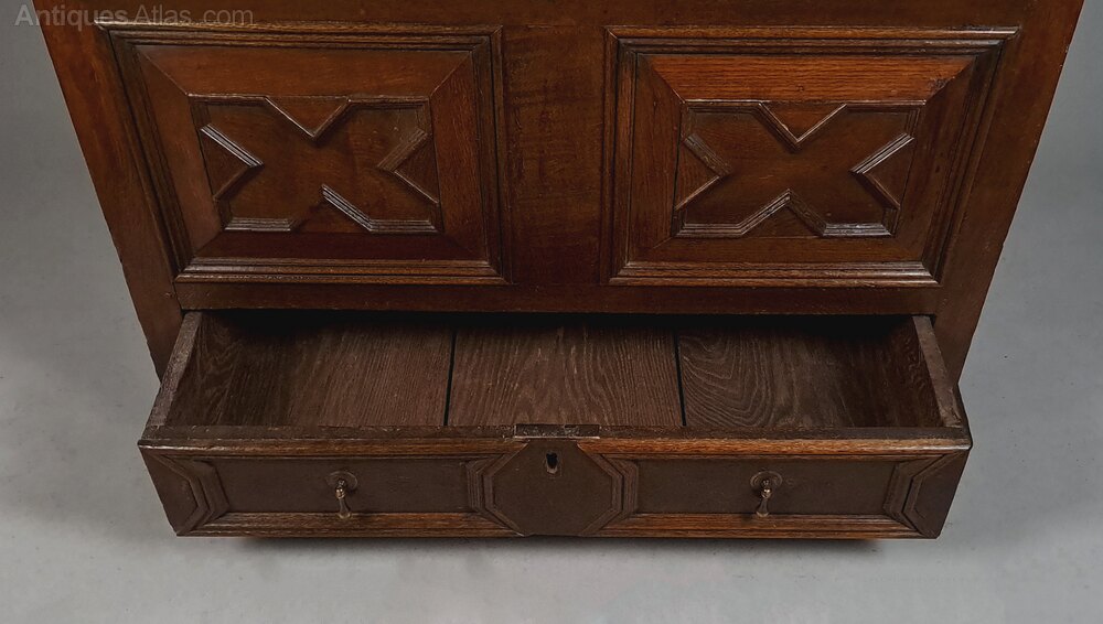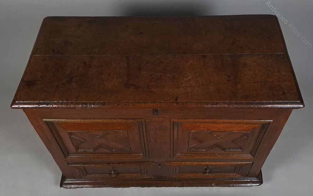 Marks, dings, scuffs and minor losses consistent with age and use. The lock to the lower drawer is original. The lid opens to reveal the original oak candle box. Some wooden straps/reinforcement have been added to the underside of the lid – probably in the 19th century – just a belt and braces piece of restoration which is often seen on such early coffers.