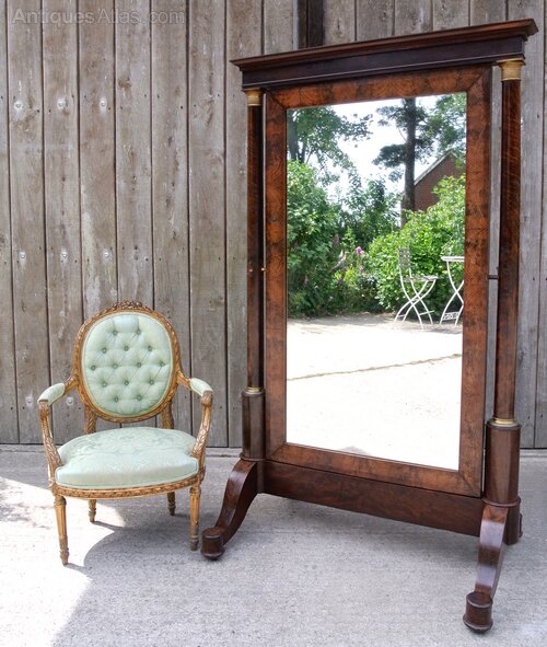 An impressively large and beautiful English cheval mirror of particularly fine quality and dating from c.1815.Of French Empire design, the original frame with substantial tapering columns of figured mahogany mounted with exquisitely incised bronze mounts in the classical form, and the base of each column with large bronze rings of matching form.