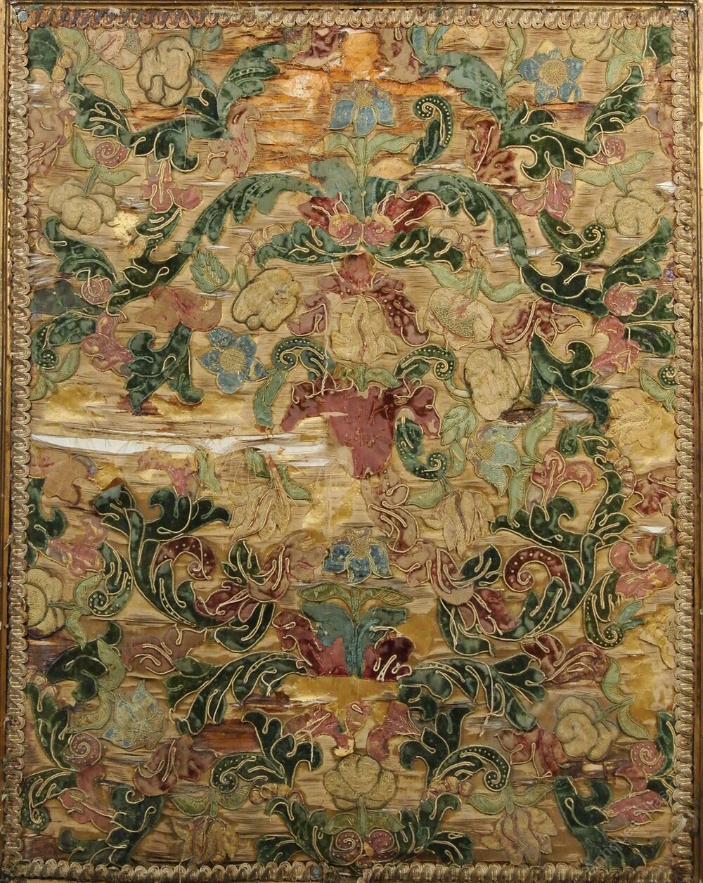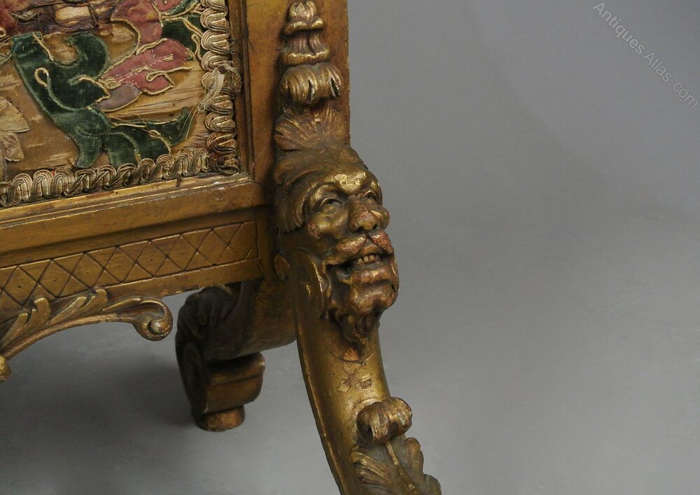 Set within the screen is a panel of 16th century silk and petit point English stump work of fabulous quality and retaining strong bright colours. With some depletions and fraying.