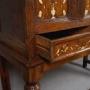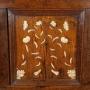 The inlay work is superb and in excellent condition for age, delicately shaped and decorated vases with stems of daisies, poppies and clematis, and the decorated baskets in the lower corners of the central panel are full of cut flowers. The skill of the craftsman to execute such work with no electricity and only basic tools in such fine detail is immense. The ivory was first delicately split and thinned and then cut, shaded by gentle burning and hand engraved with each detail before being inlaid into recessed identically shaped cut outs in the panels.