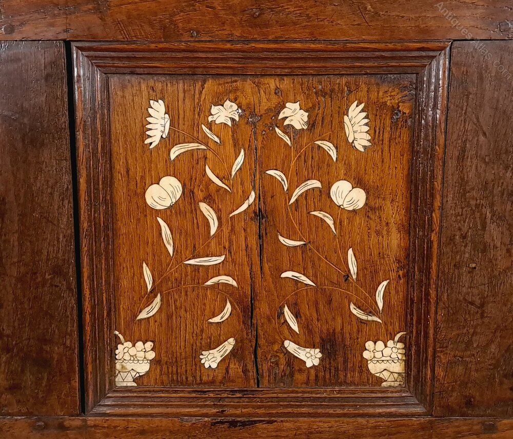 (Ivory submission certificate number: SSSBD8TD)A substantial and unusual solid elm and oak chest with a really beautiful colour and rich patina with three fielded panels over two original drawers inlaid with floral and foliate marquetry in ivory.
