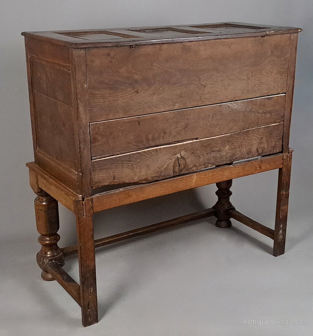 Original pegged joints with tiny squared pegs which sit a few mms proud as they should. The whole chest is raised on an elm and oak stand of similar date - but probably associated - with substantial turned front legs united by a box stretcher with original pegs and through tenons. Evidence of old worm to the drawer linings and beneath the chest but nothing significant and all is structurally sound and heavy, and the worm is long since dead.