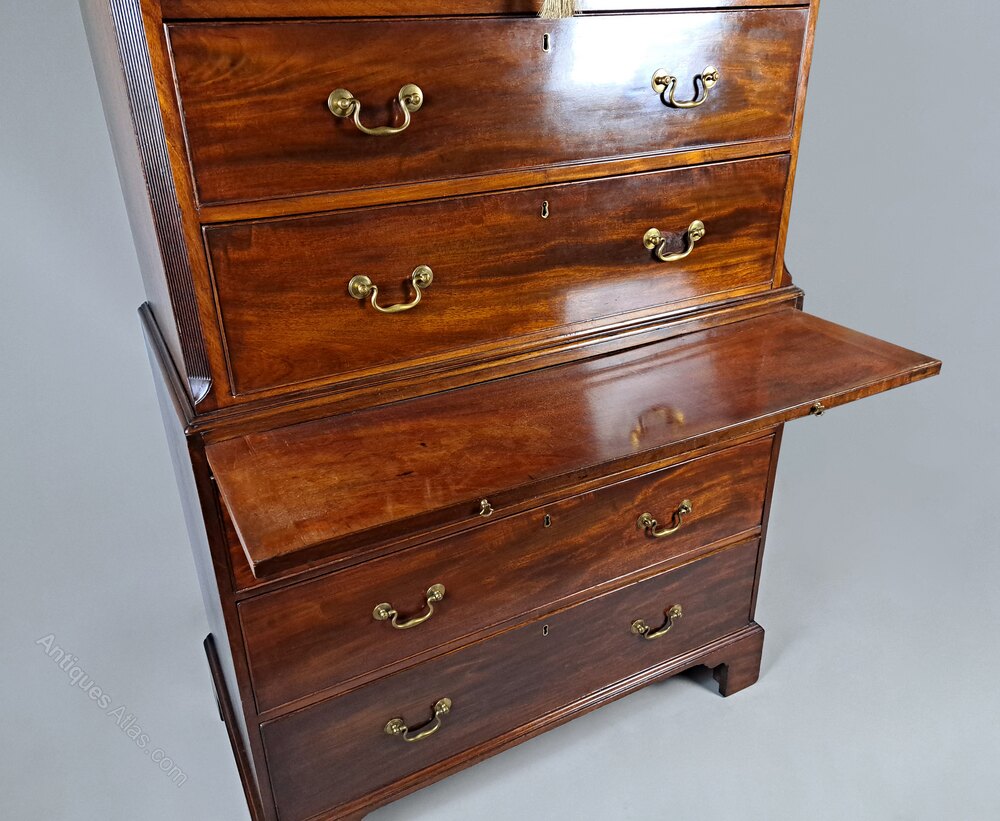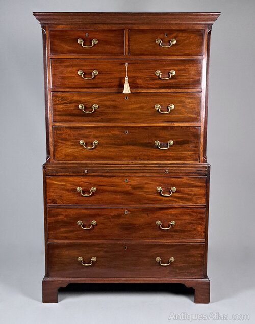 With a beautiful natural colour and rich patination, a very high quality George III mahogany chest on chest of elegant and well balanced proportions, and retaining all original brass handles and escutcheons.The chest with a wide splayed double ogee cornice over two short frieze drawers and six long graduated drawers all with beautifully grained mahogany fronts of excellent colour. All of the drawers run smoothly with solid oak original linings with very finely cut dovetails.