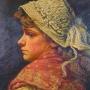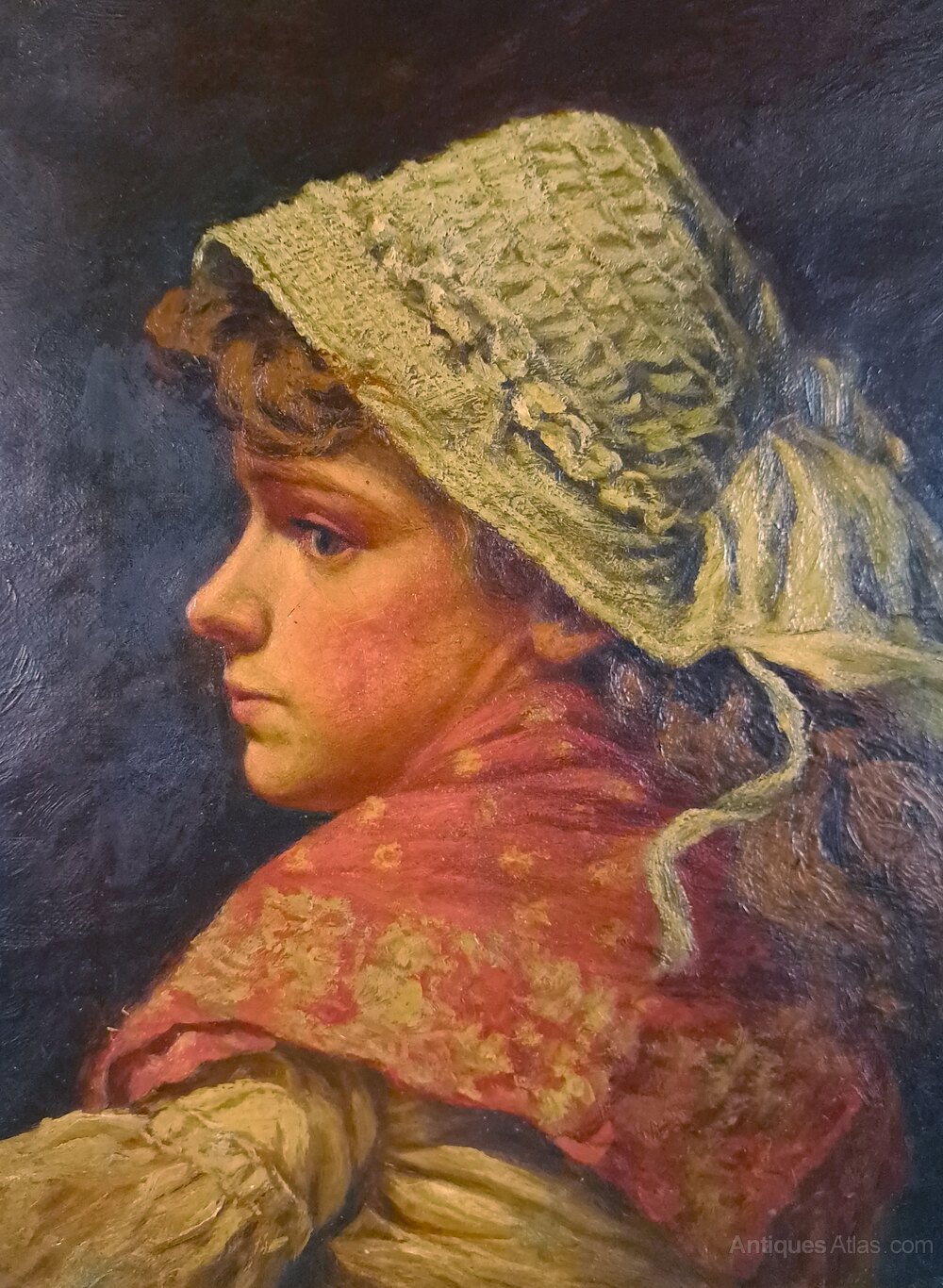 A beautiful original oil on canvas in the manner of Charles Sillem Lidderdale RBA (b. 1831 d. 1895) of a young woman in a woven bonnet and patterned shawl looking back over her shoulder.Lidderdale was a British artist. He painted a series ‘peasant women’ including of a ‘fishergirl’ in similar pose but he did not sign all of his work and this painting is not signed or monogrammed. However the subject, colours, tones and brush techniques used here closely match Lidderdale’s signed paintings which reside in National Galleries worldwide.