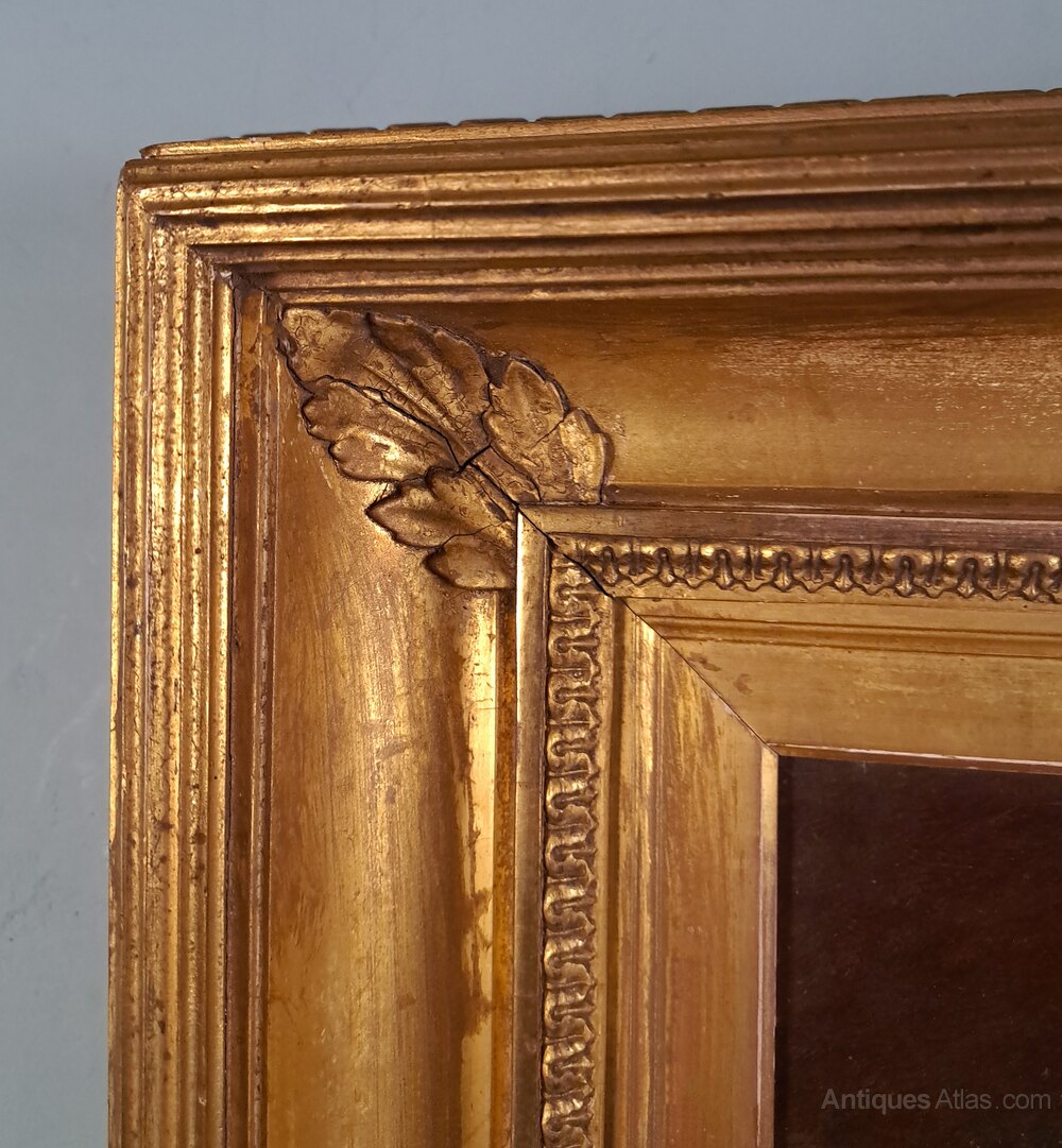 In a very good carved 19th century water gilded frame with leaf carved corners and finely detailed inner foliate and reeded and crossed outer borders and which appears original.