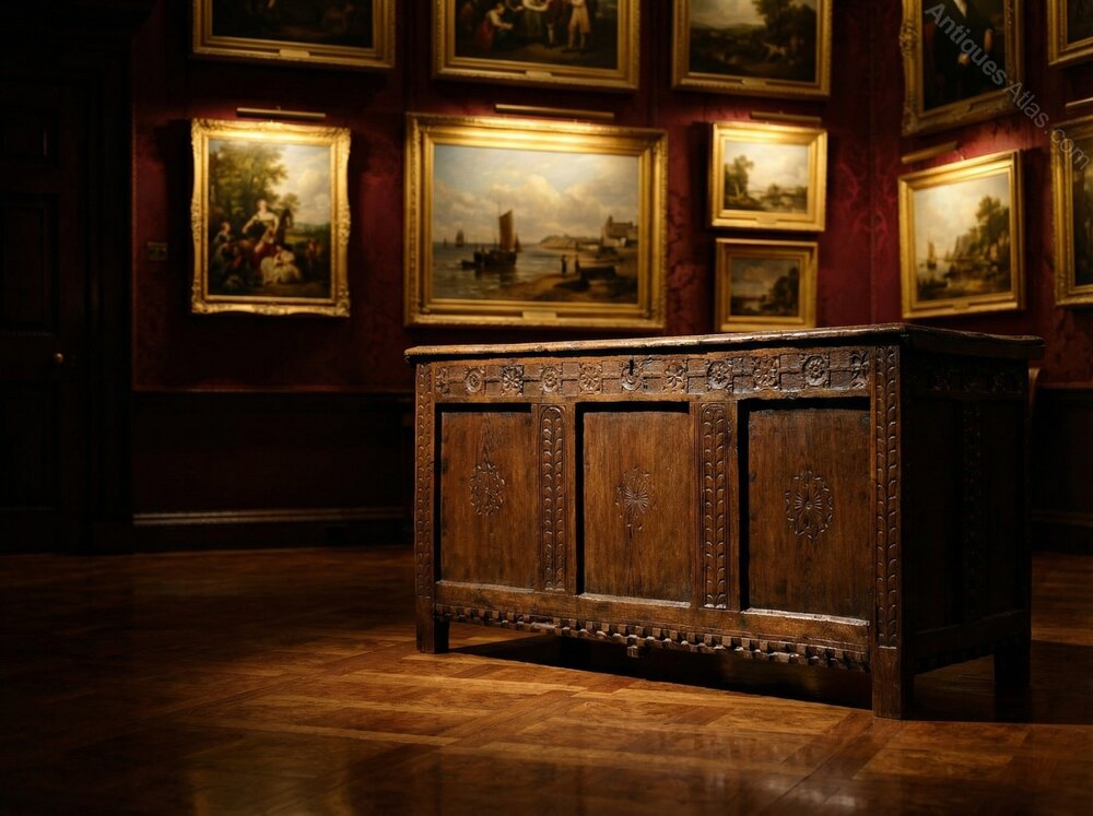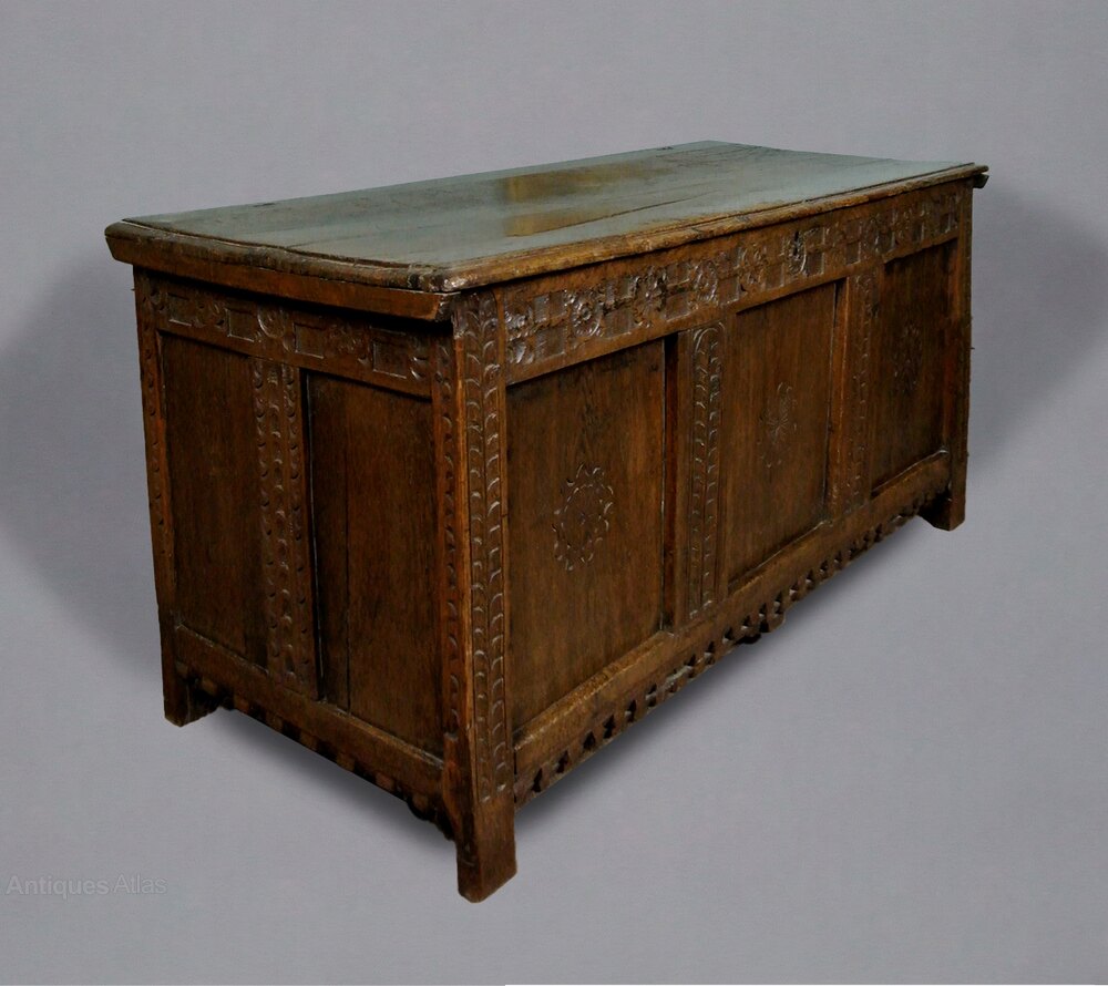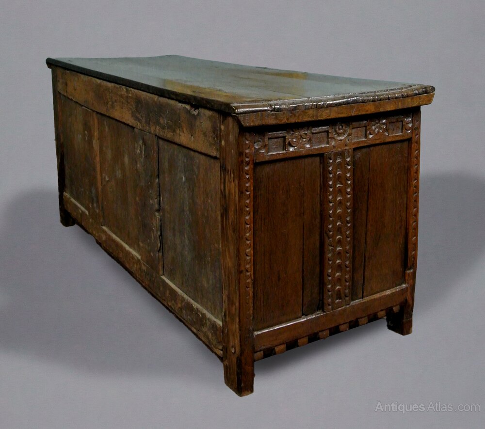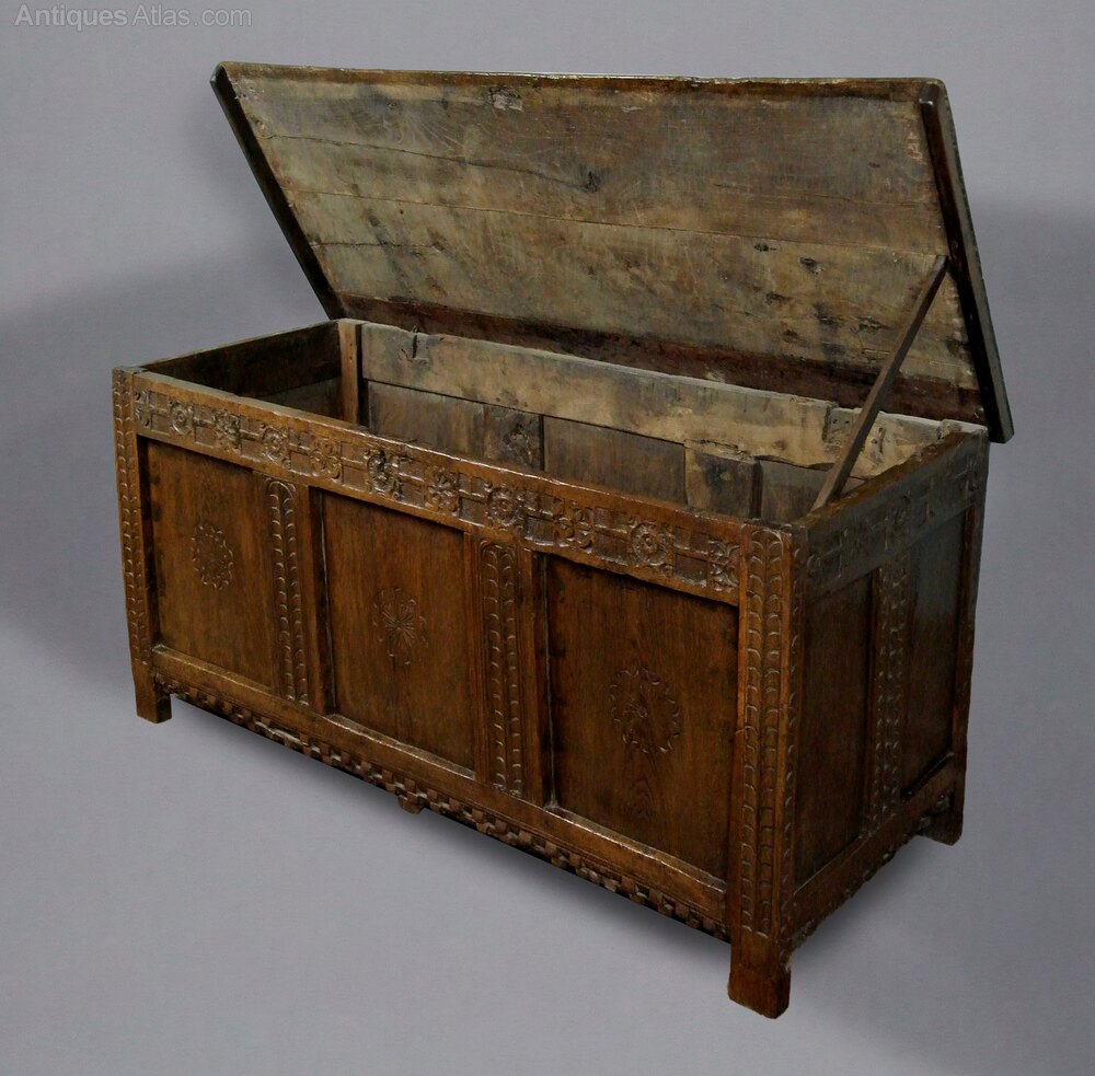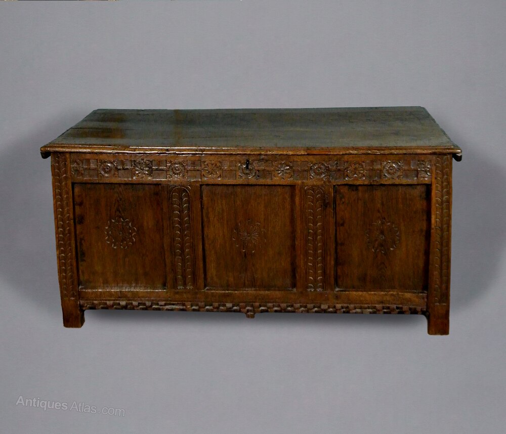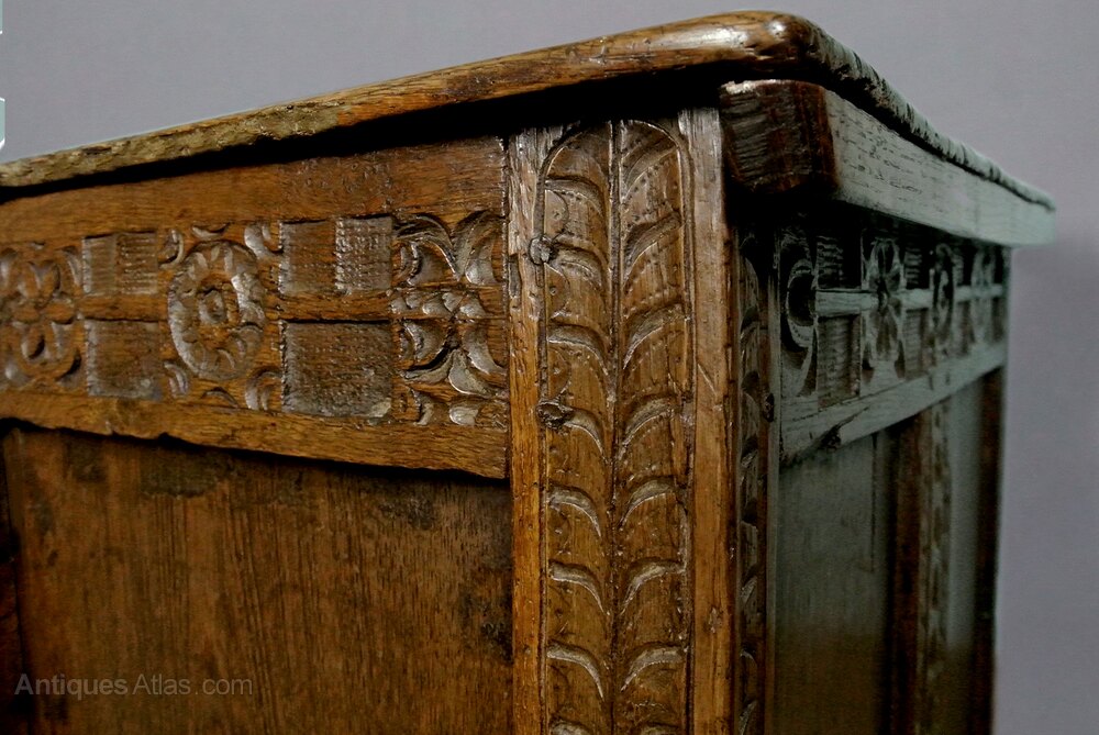 An early joined oak coffer with original carving of palmettes to the stiles at front and side panels and with geometric, rose carved wheels to the top rail and with a blocked and carved bottom rail which continues to both sides panels. The side stiles carved with double running cableThese are all early motifs, typically seen in Elizabethan and early 17th century furniture. The three fielded panels to the front of the chest are square rather than the more usual rectangular form. Each of these is carved with central daisy form roundel with ribboned border.