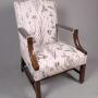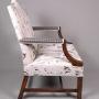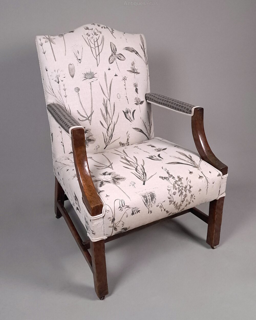 The whole has recently been re-upholstered in a wildflower grey patterned thick linen fabric with an ivory ground. The back and arms in a complimentary ‘beetle’ fabric. With two matching cushions.
