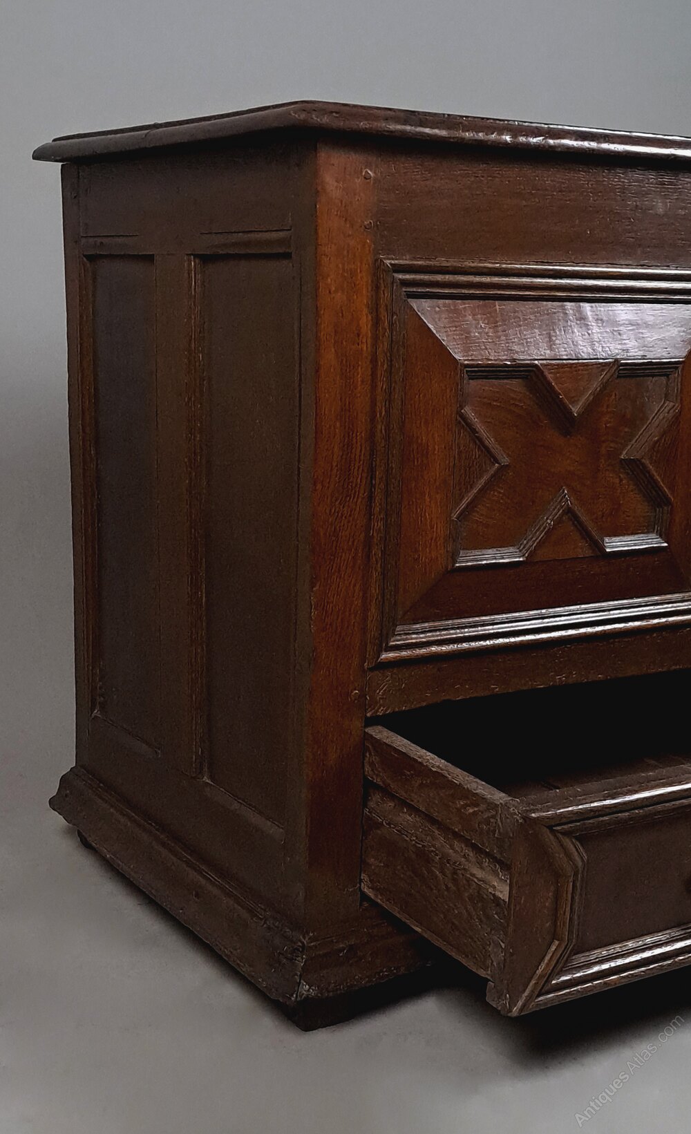 The coffer sits on original stile feet which are intentionally concealed by the well shaped flared apron around the base – a lovely quality detail.