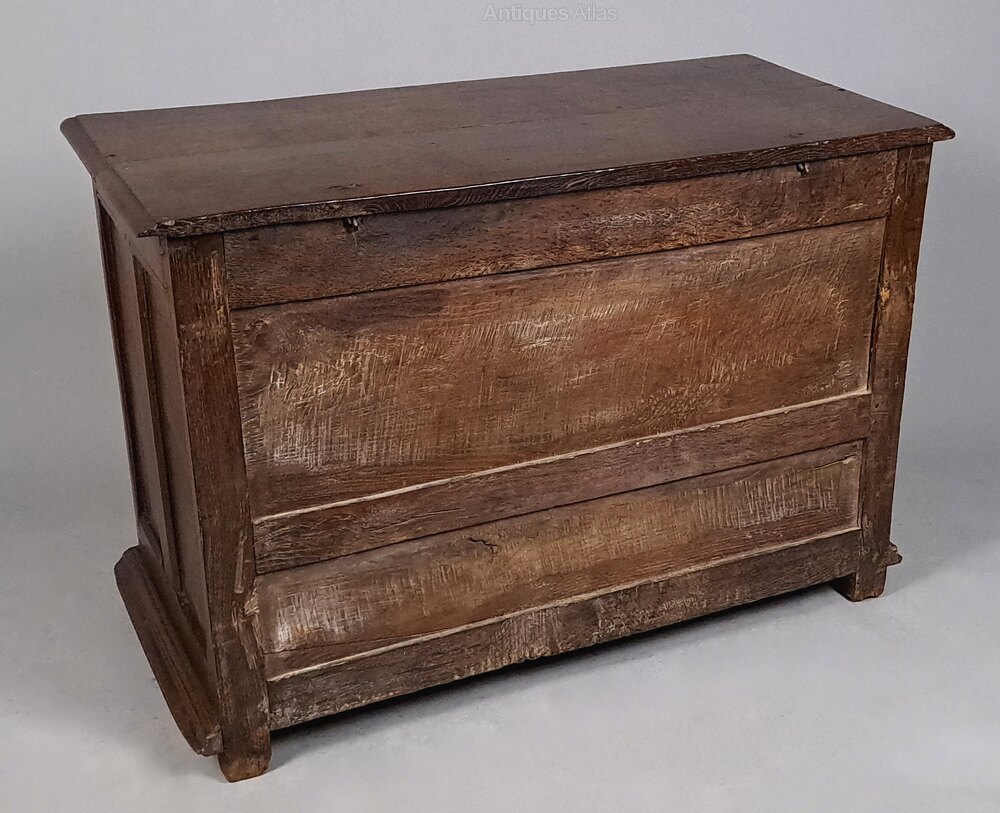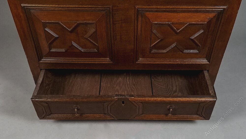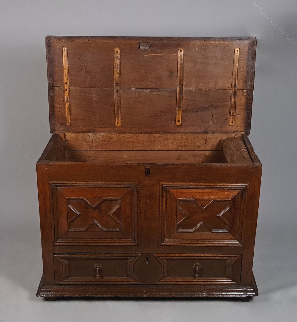 Marks, dings, scuffs and minor losses consistent with age and use. The lock to the lower drawer is original. The lid opens to reveal the original oak candle box. Some wooden straps/reinforcement have been added to the underside of the lid – probably in the 19th century – just a belt and braces piece of restoration which is often seen on such early coffers.