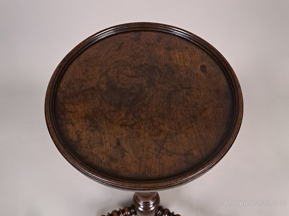 A really good oak candle stand, the dished top with fantastic colour and patination on turned bobbin and bulb column with tripod turned bobbin and bulb supports with original tall and well shaped feet.Sturdy and usable, a good height and can be comfortably used as a side or wine table.