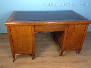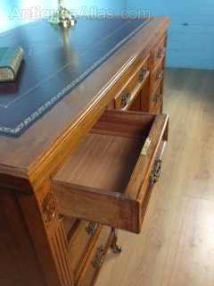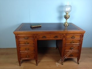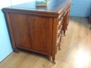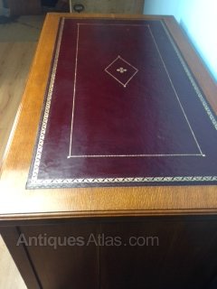 Good quality double pedestal writing desk. Original brass handles and mahogany linings to drawers. New burgundy leather top with gold tooling.DateLate Victorian :