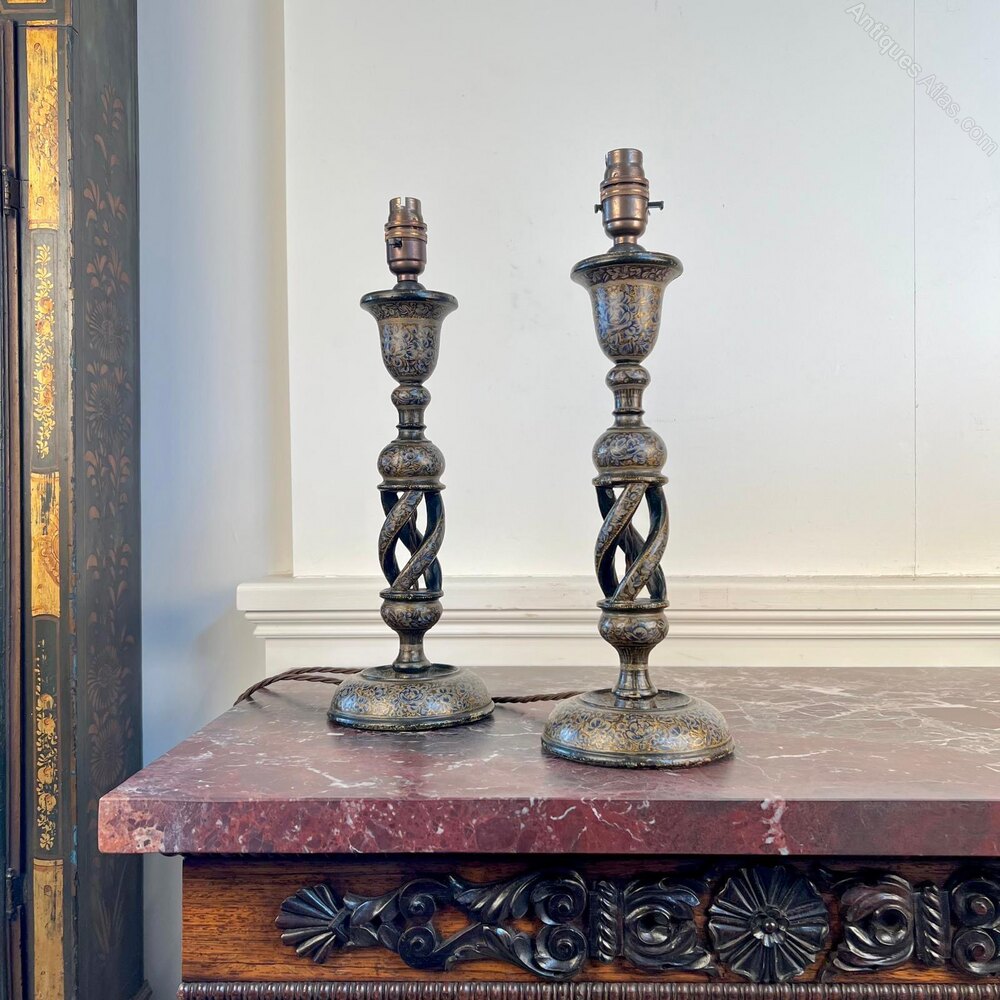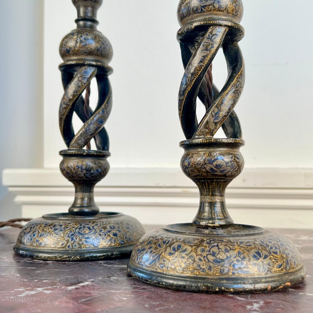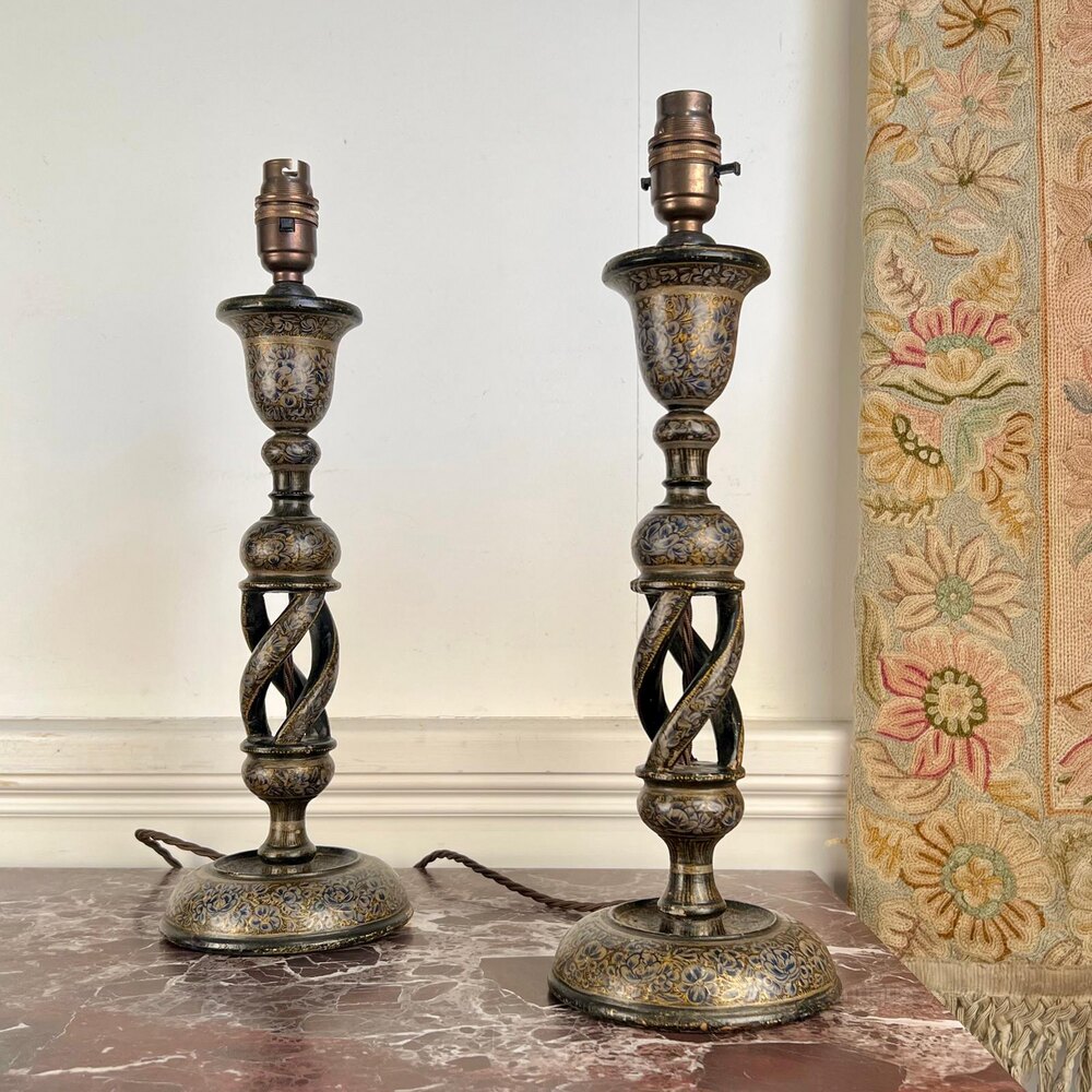 A super pair of Edwardian Kashmiri table lamps with the original hand painted decoration and in really lovely condition throughout. Re-wired and PAT tested, shades not included. English, Circa 1910.Dimensions: Height: 36 cm - 15 Inches, Diameter: 12 cm - 4 3/4 Inches