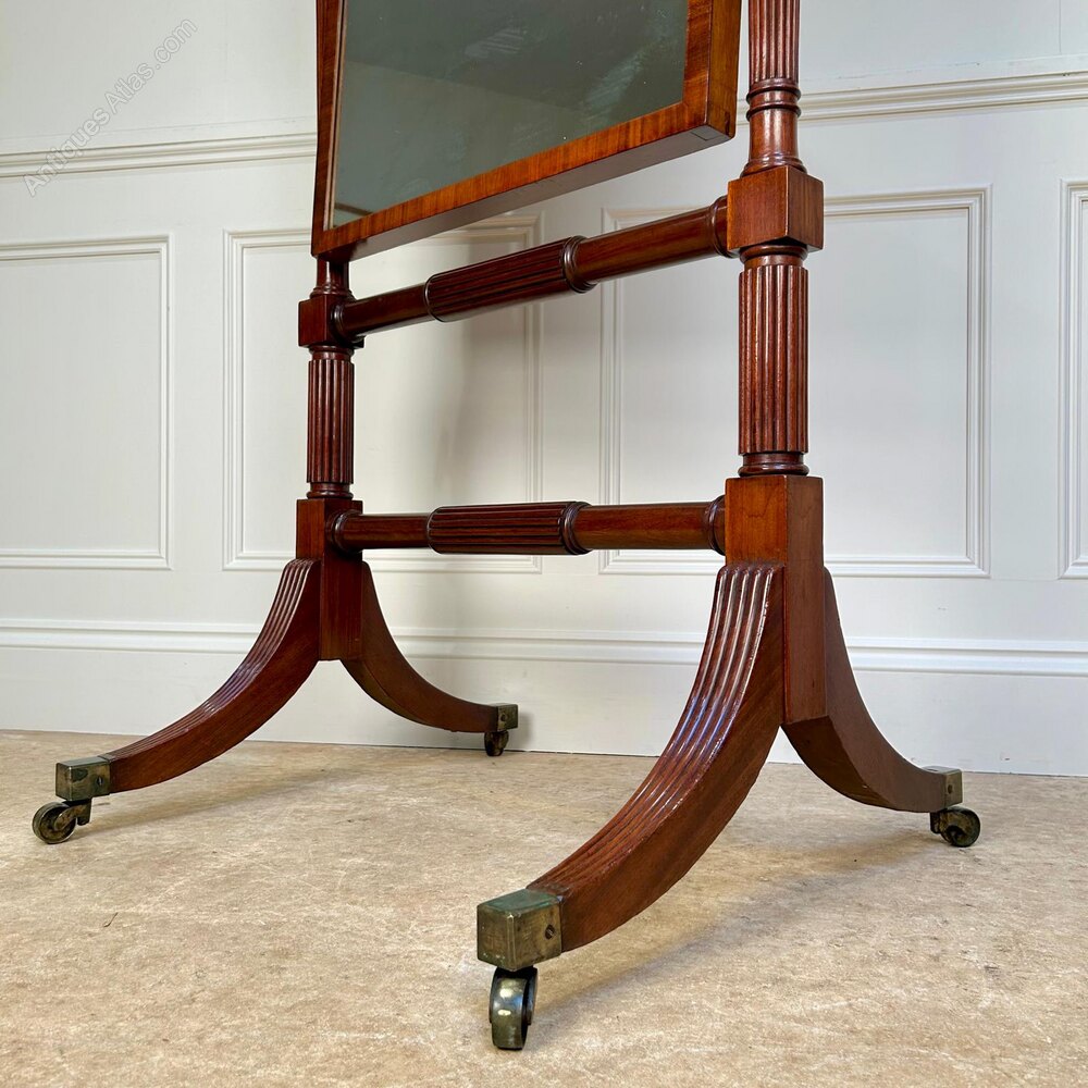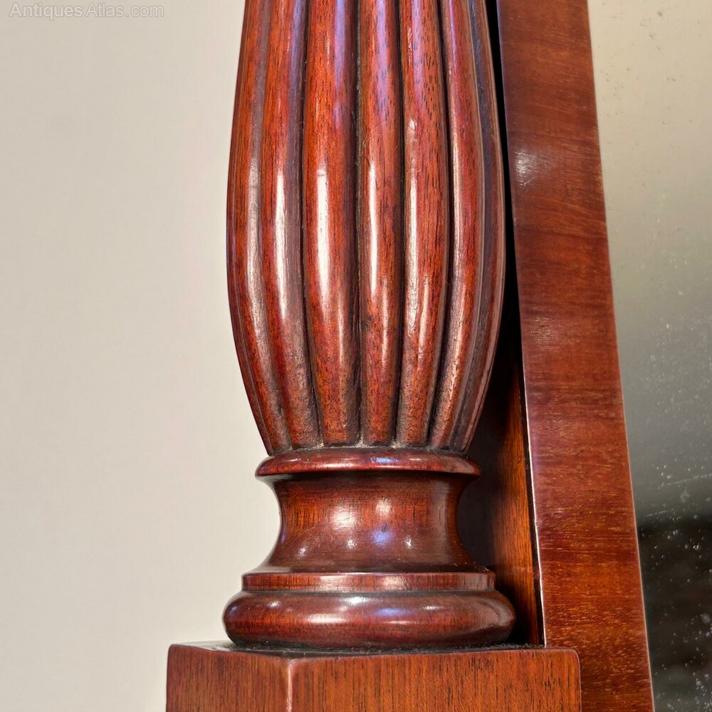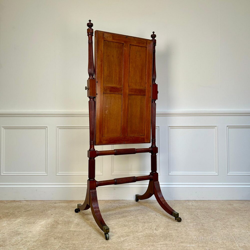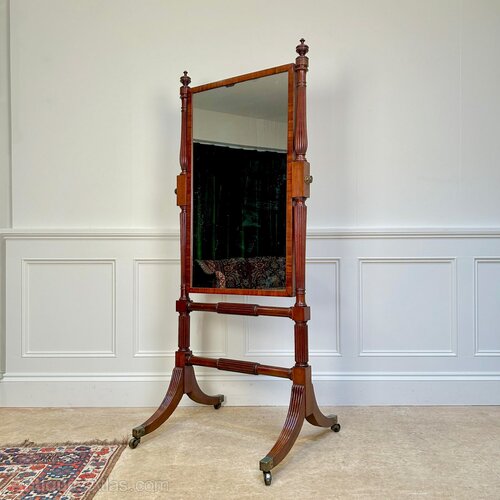 A Gillows mahogany cheval mirror of wonderful quality. The original rectangular mirror plate with a crosss-banded frame with reeded supports and turned finials. The whole raised on reeded outswept legs with original gilt lacquered brass castors. Super colour and condition throughout. Atb, English, Circa 1810.Dimensions: Height: 162.5 cm - 64 Inches, Width: 70 cm - 27 1/2 Inches, Depth: 61 cm - 24 Inches