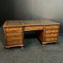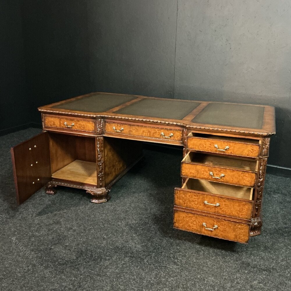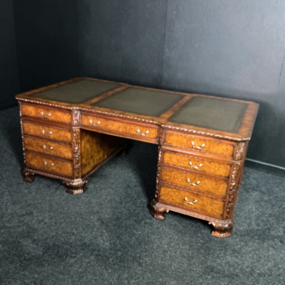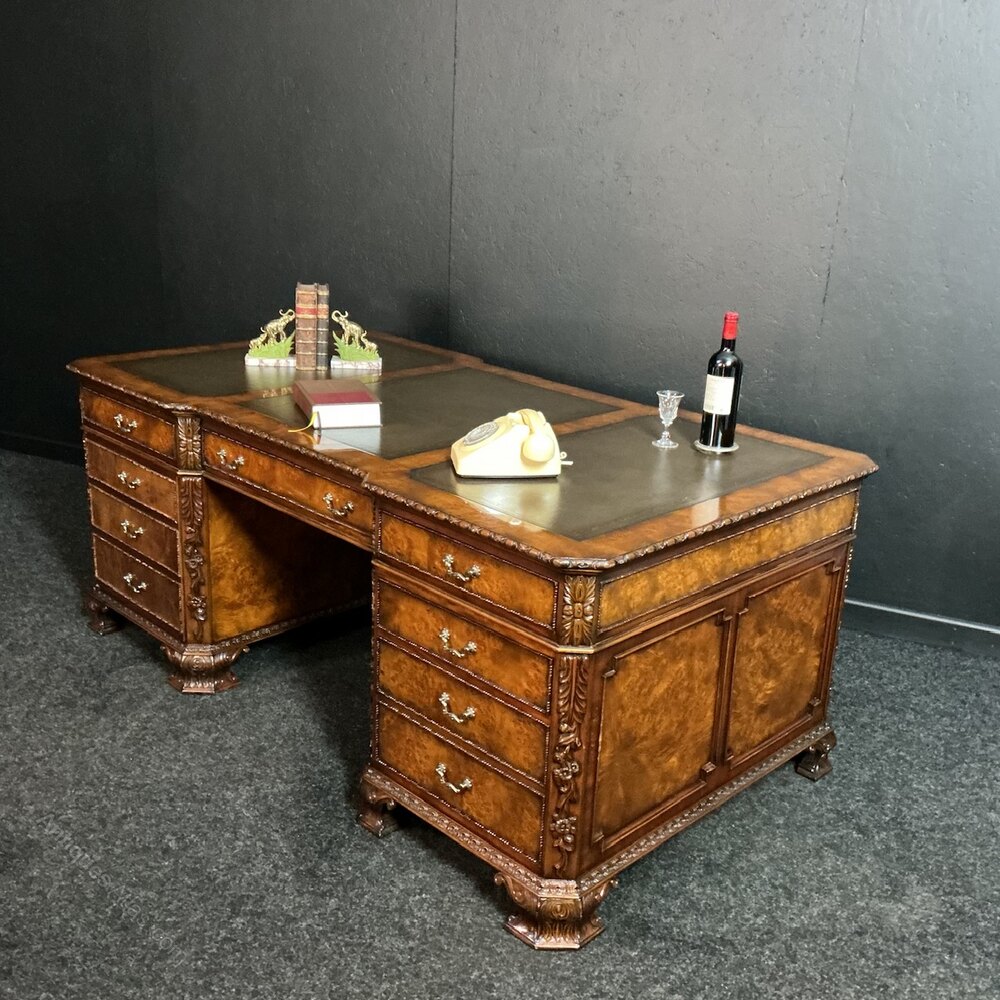 Fine quality reproduction Burr Walnut partners desk reputedly cost in excess of £7000 20 years ago. Oak lined throughout and fortunately breaks into 3 pieces for transportation.18th century, Chippendale in design and with crisp carving throughout… with drawers to the right and cupboards to the left (both sides) and in very good condition.