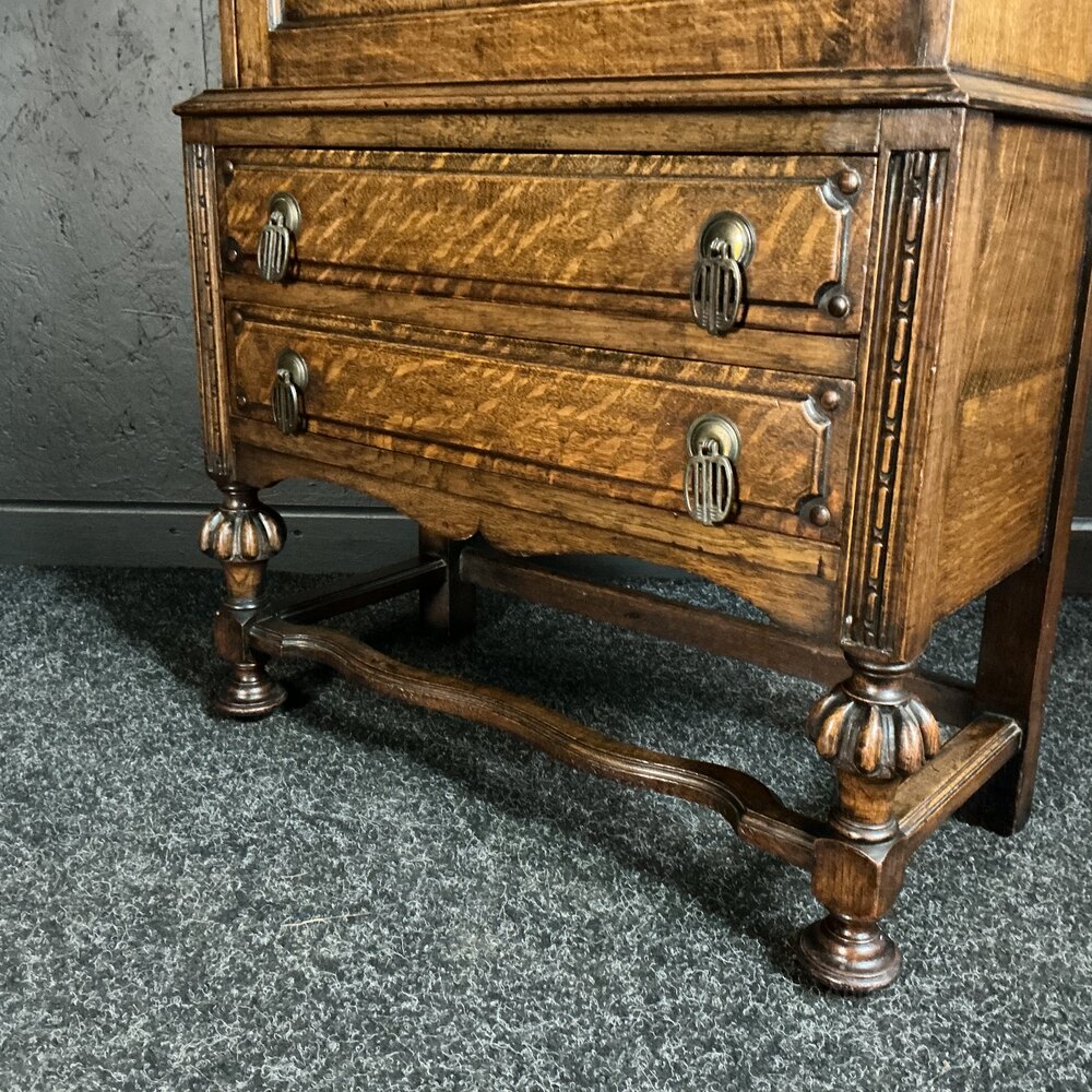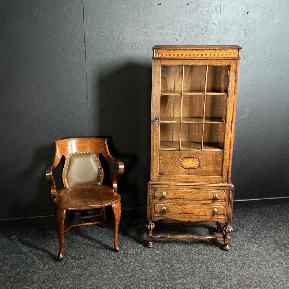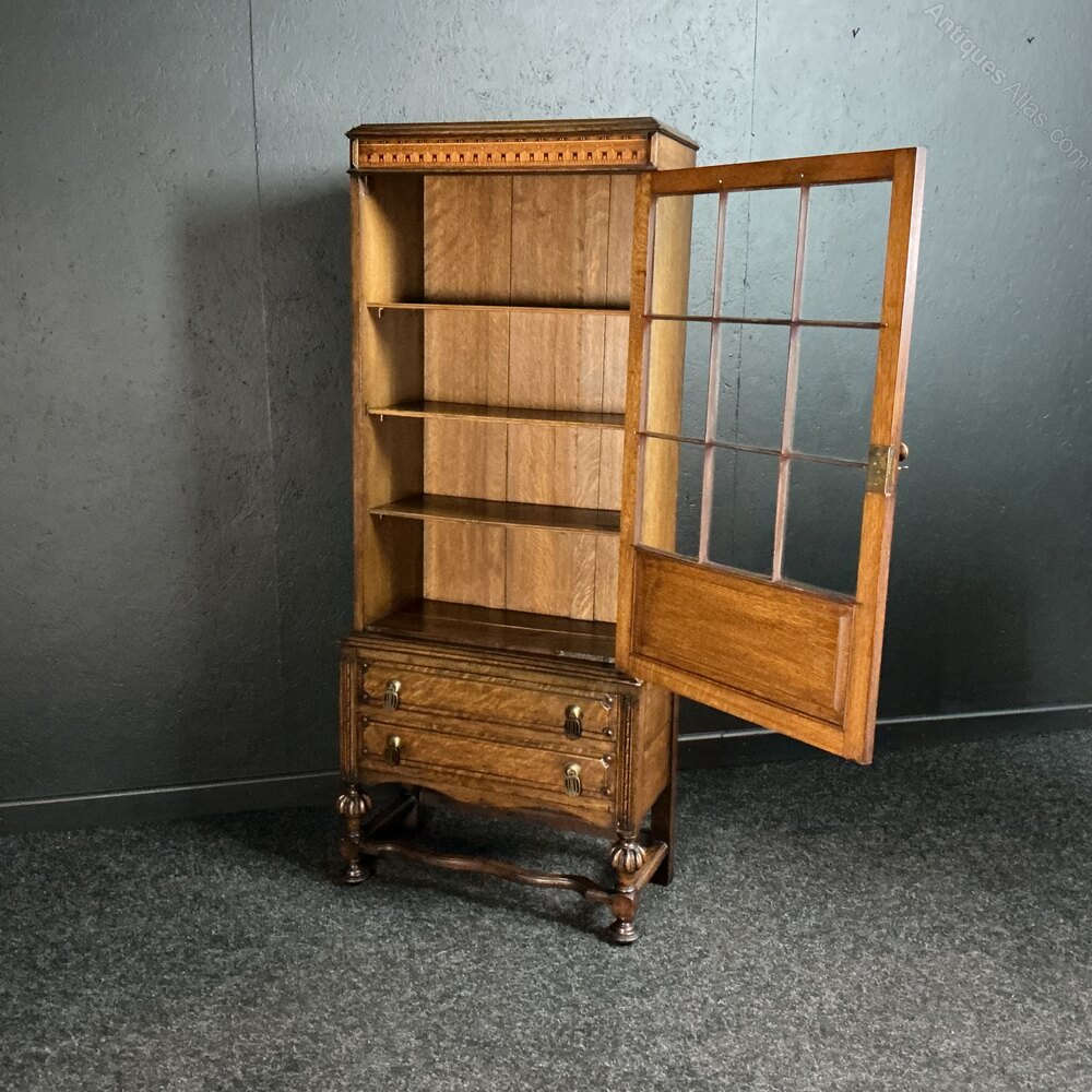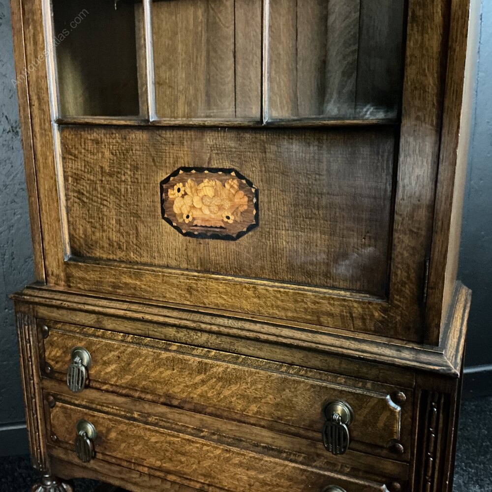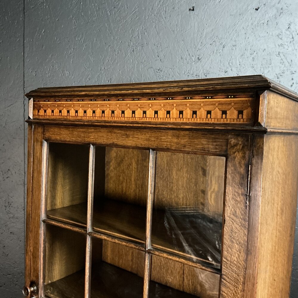 An unusually small solid Oak bookcase of much above average quality. Very rare to get a marquetry panel set into the base of the door, complimented with parquetry inlays to the cornice. The handles have a pre Art Deco design, whilst the base has nicely turned and fluted legs with shapely stretchers in between. Even the shelves are solid Oak with reeded front edge. Condition is very good and ready for the next 100 years.Free UK mainland delivery on this piece.