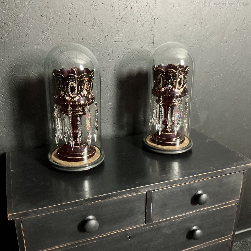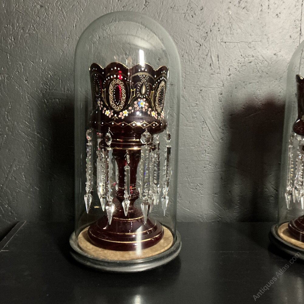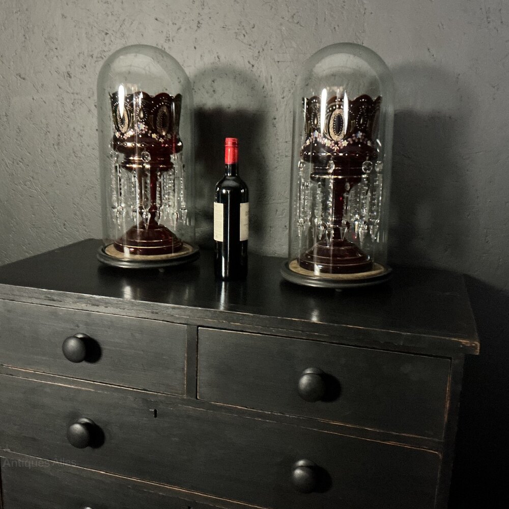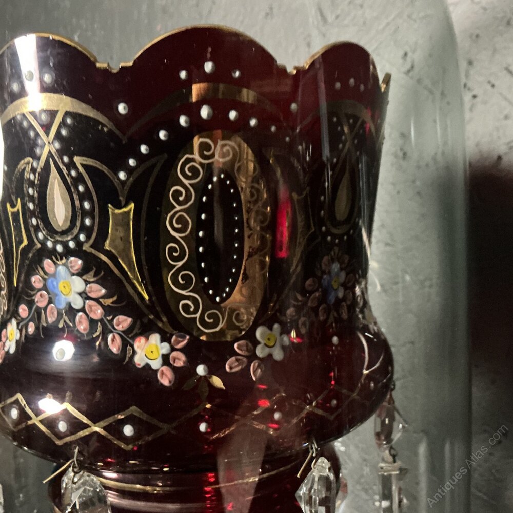 A beautiful pair of Victorian Ruby glass lustres. Best quality. Hand painted decoration, double row of clear glass drops. Get the light right and they send prisms around the room..Totally original and in super condition.
