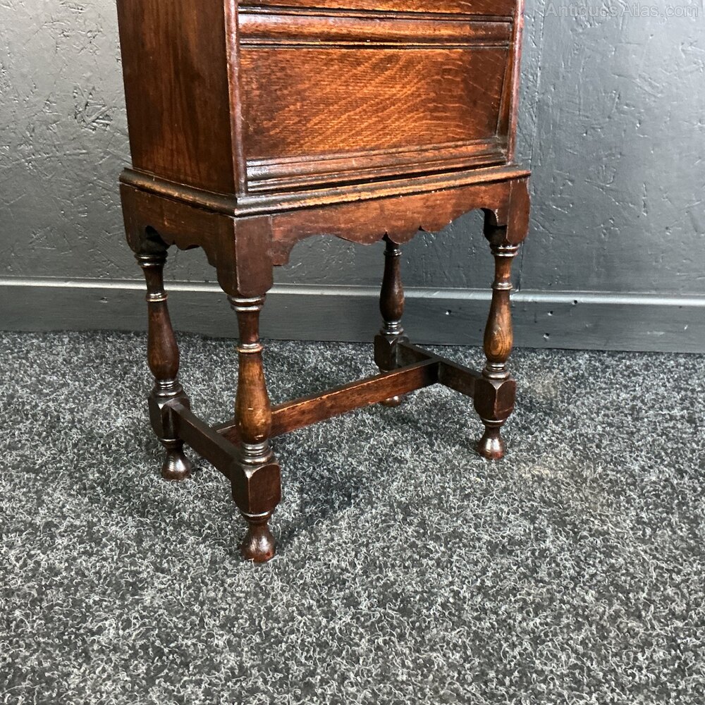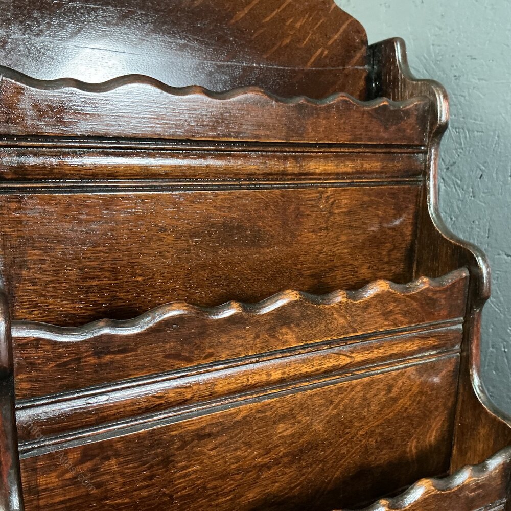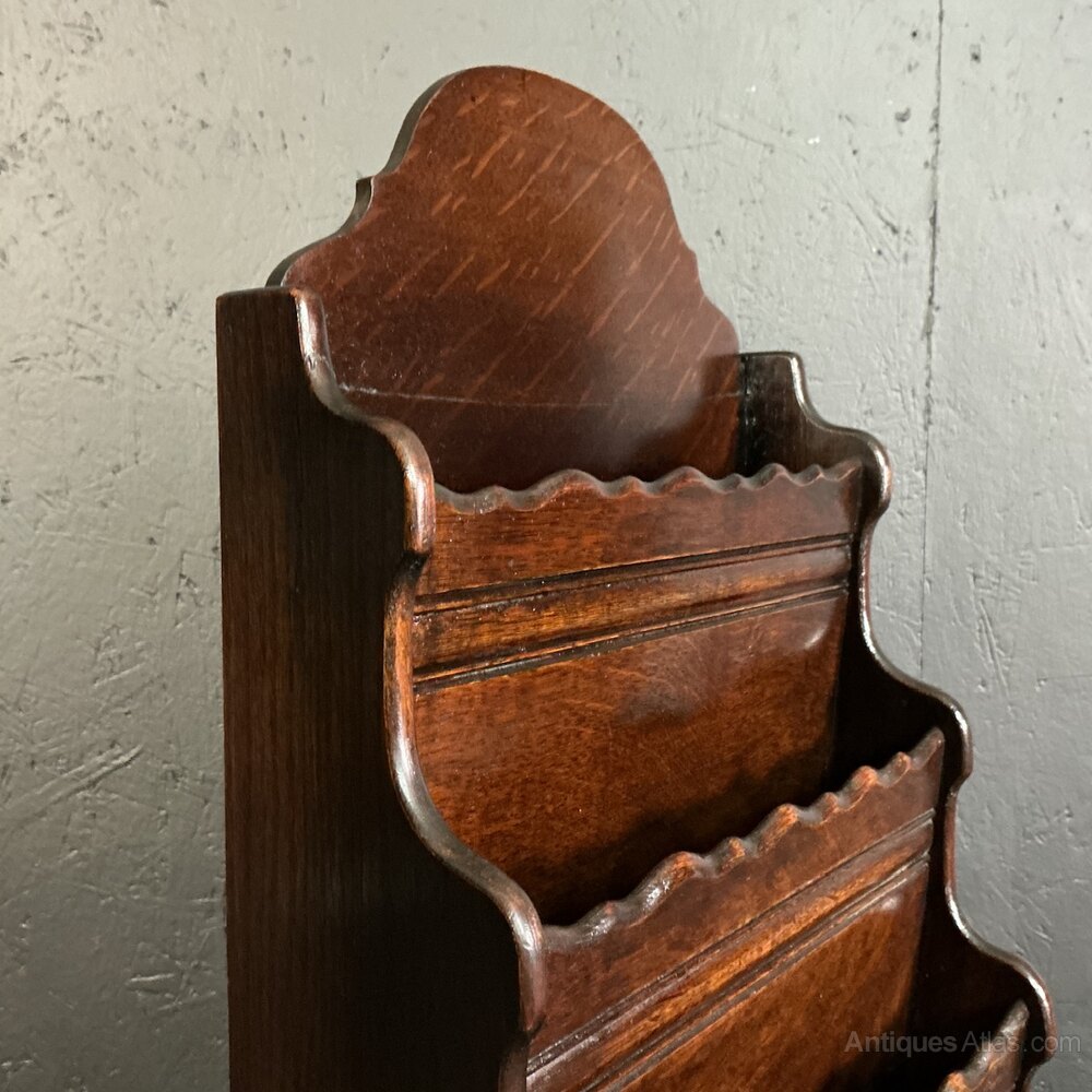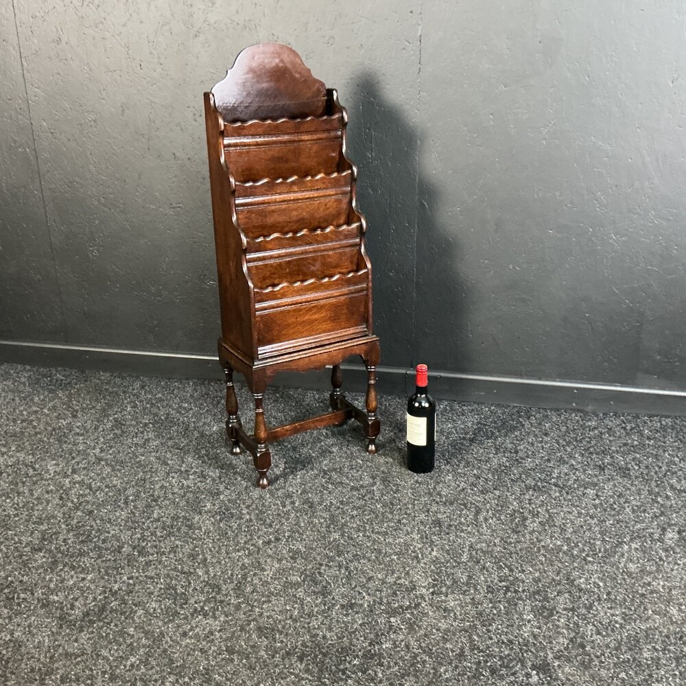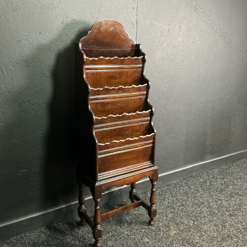 An unusual tall and slender , 4 tiered magazine rack from the 1920s. Solid Oak and in very good condition. The graduated compartments sit on turned legs with triple stretchers to keep it sturdy. H.108cm…D.23cm…..W.37cm.Free UK mainland delivery on this piece.