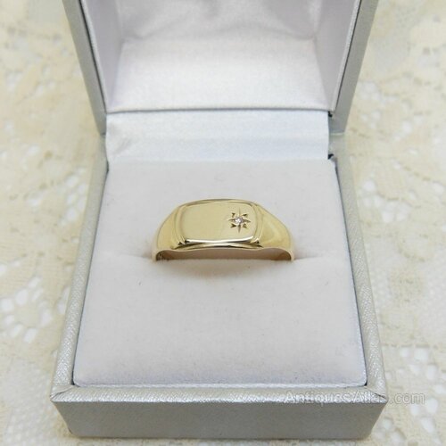 Vintage 9ct gold diamond set signet ring hallmarked Sheffield 1989 size U.A lovely 9ct yellow gold rectangle top signet ring with a star set diamond to the left hand side. This vintage 1980's ring is mainly smooth polished gold with only a light engraved border to edge of the top. Inside it is fully hallmarked Sheffield 1989.