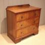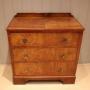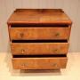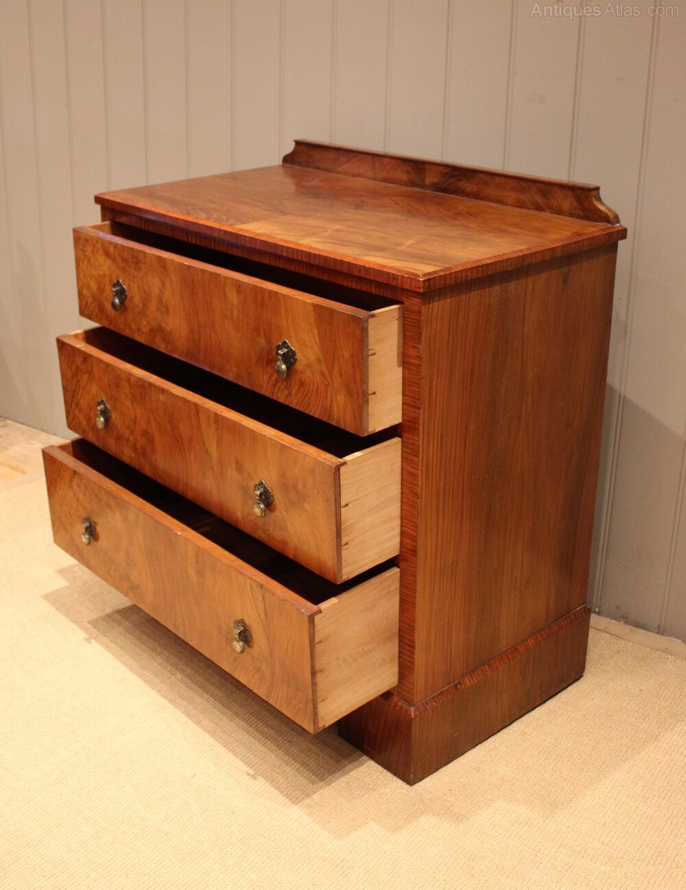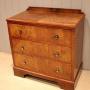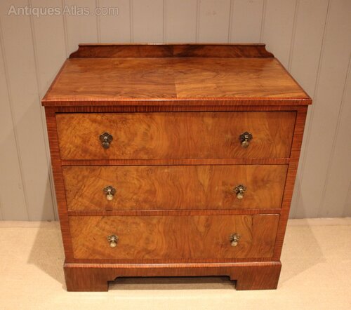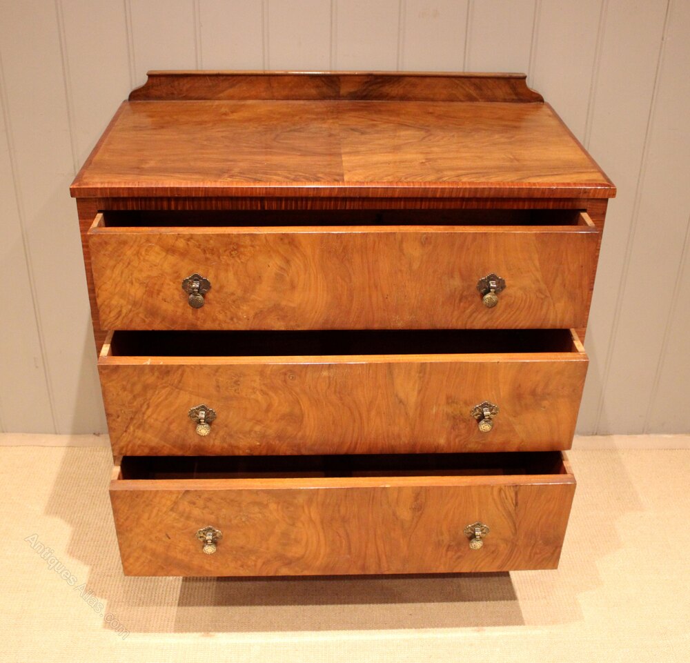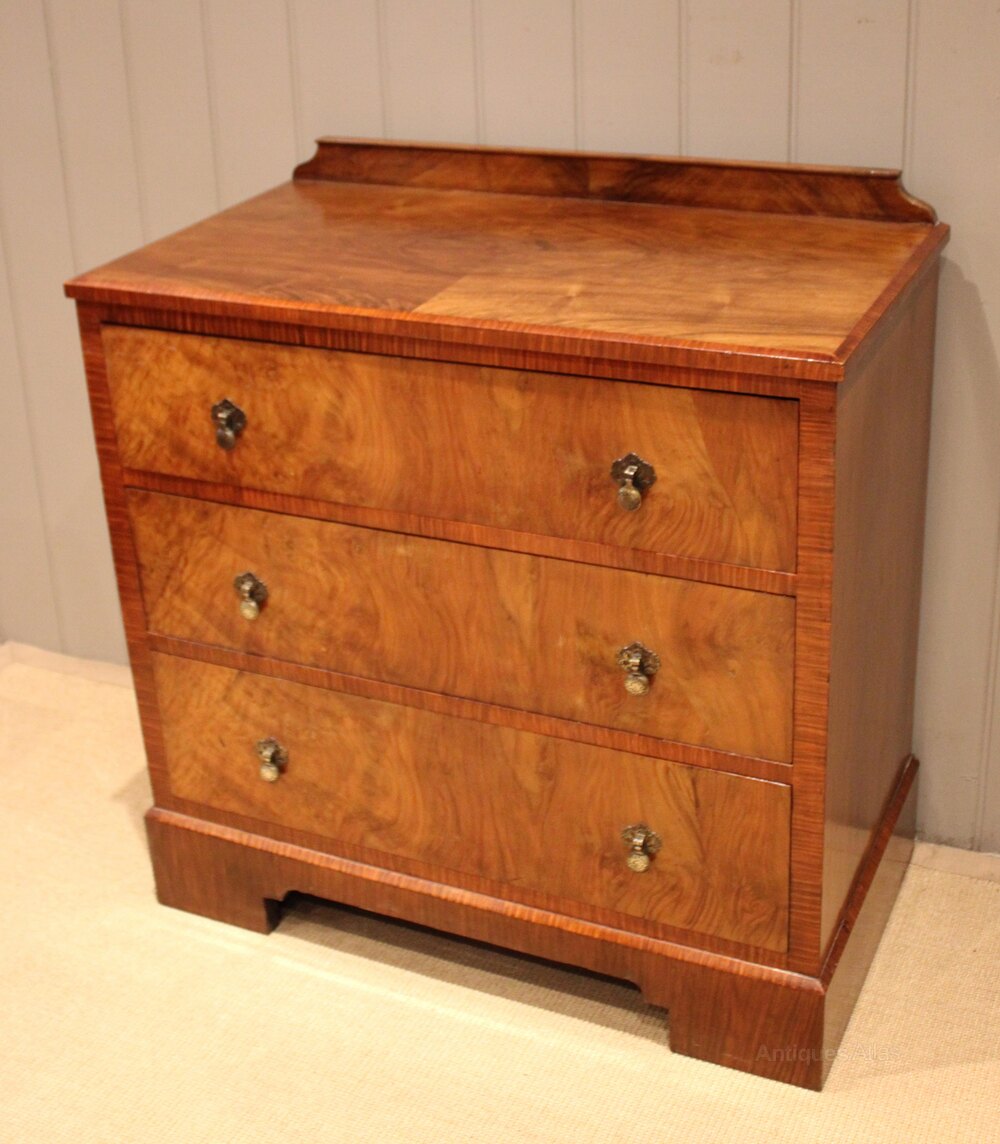Walnut chest of drawers having a quarter veneered top , three long drawers with crossbanding , raised on bracket feet .Height